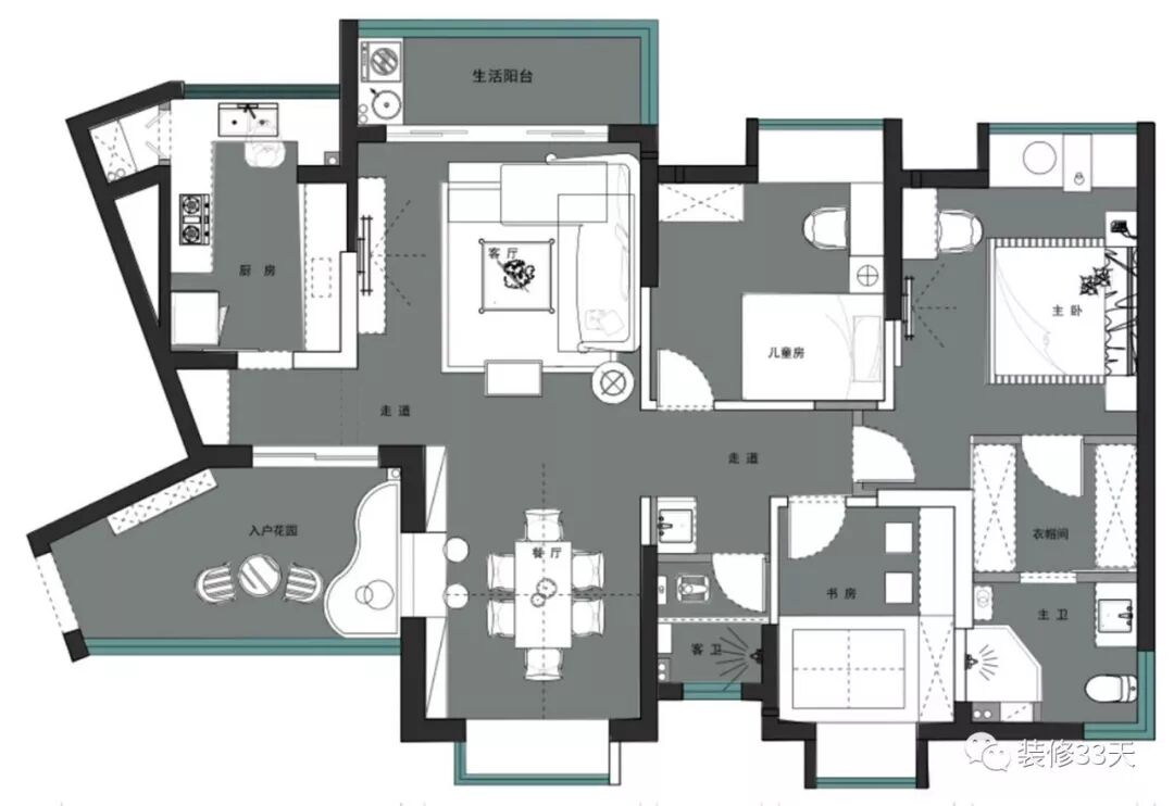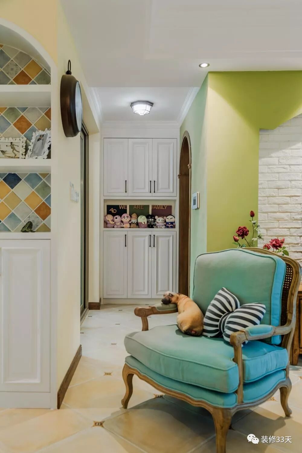 ▲ 建筑面积130平,总造价40万,不规则入户木作大面积白色储物柜,木色地板与斑驳文化砖打造成花园小景