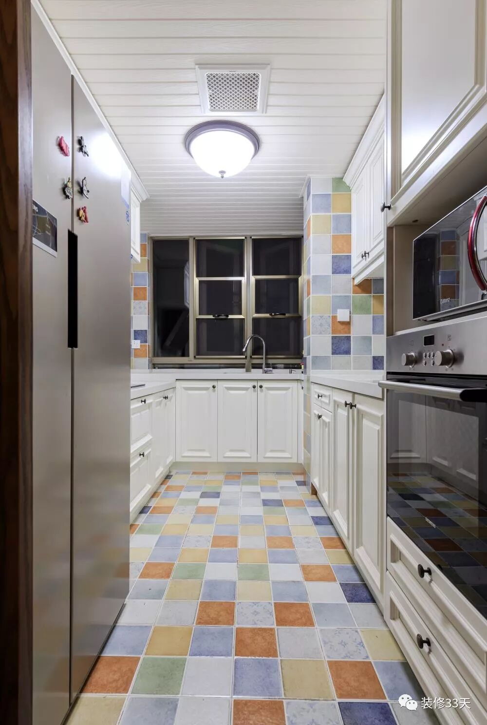 ▲ 厨房地面与墙面通铺拼色复古砖,搭配白色定制橱柜,收纳大型厨电后空间变的整洁利落