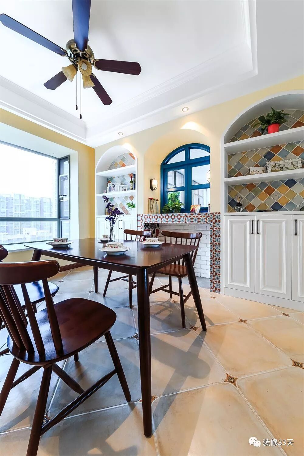 ▲ 深色实木餐桌,后方设计入墙式弧形柜体,对称造型中间砌花砖壁炉造型,蓝色小窗与玄关互通