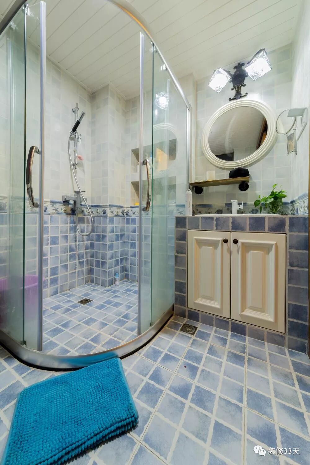 ▲ 卫生间铺贴渐变蓝色系瓷砖,加花砖腰线,自砌洗手台搭配白色门片,简洁实用