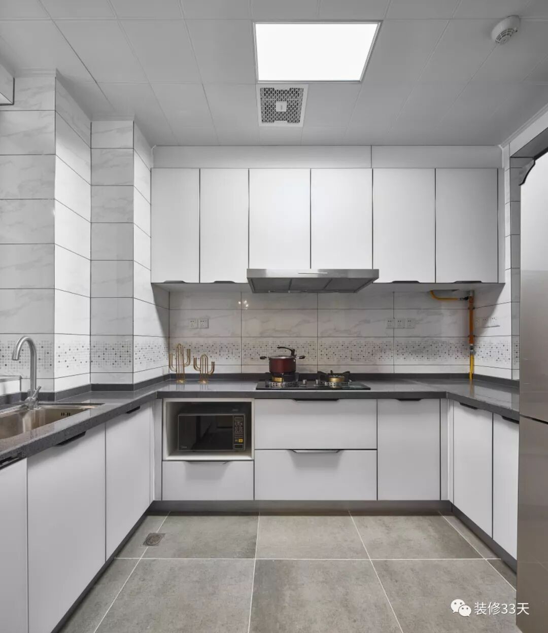 ▲ 厨房灰砖地面搭配浅色仿石纹瓷砖,采用马赛克效果砖点缀腰线,白色定制橱柜简洁干净