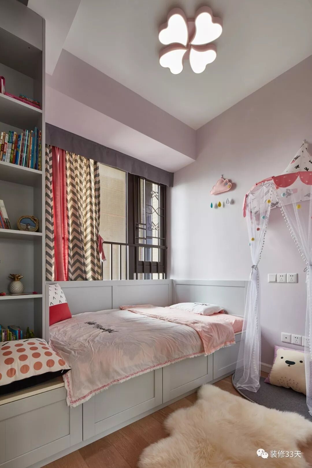 ▲ 儿童房整体以粉色为基调,榻榻米床架与柜体相连,半圆床幔与可爱墙纸,打造童趣卧室