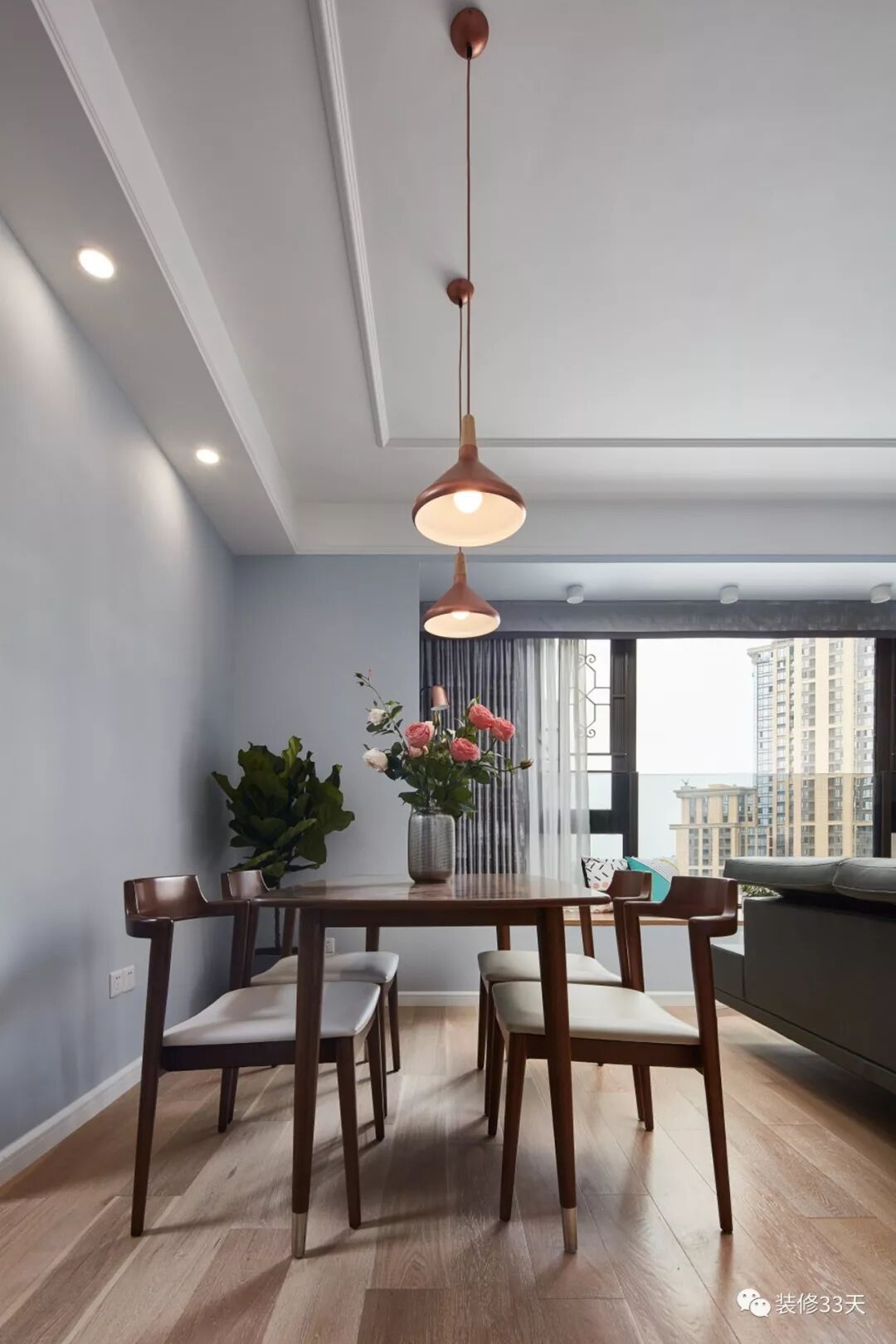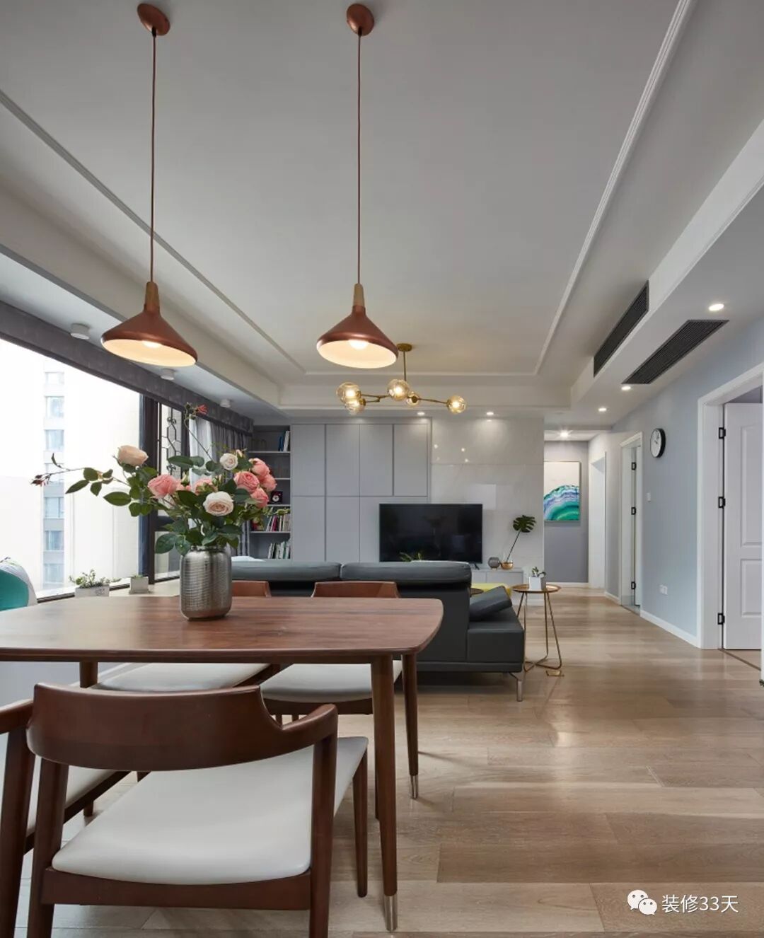 ▲ 实木地板的暖色调搭配灰色乳胶漆墙面,实木餐桌椅搭配两盏玫瑰金吊灯,温馨不失文雅