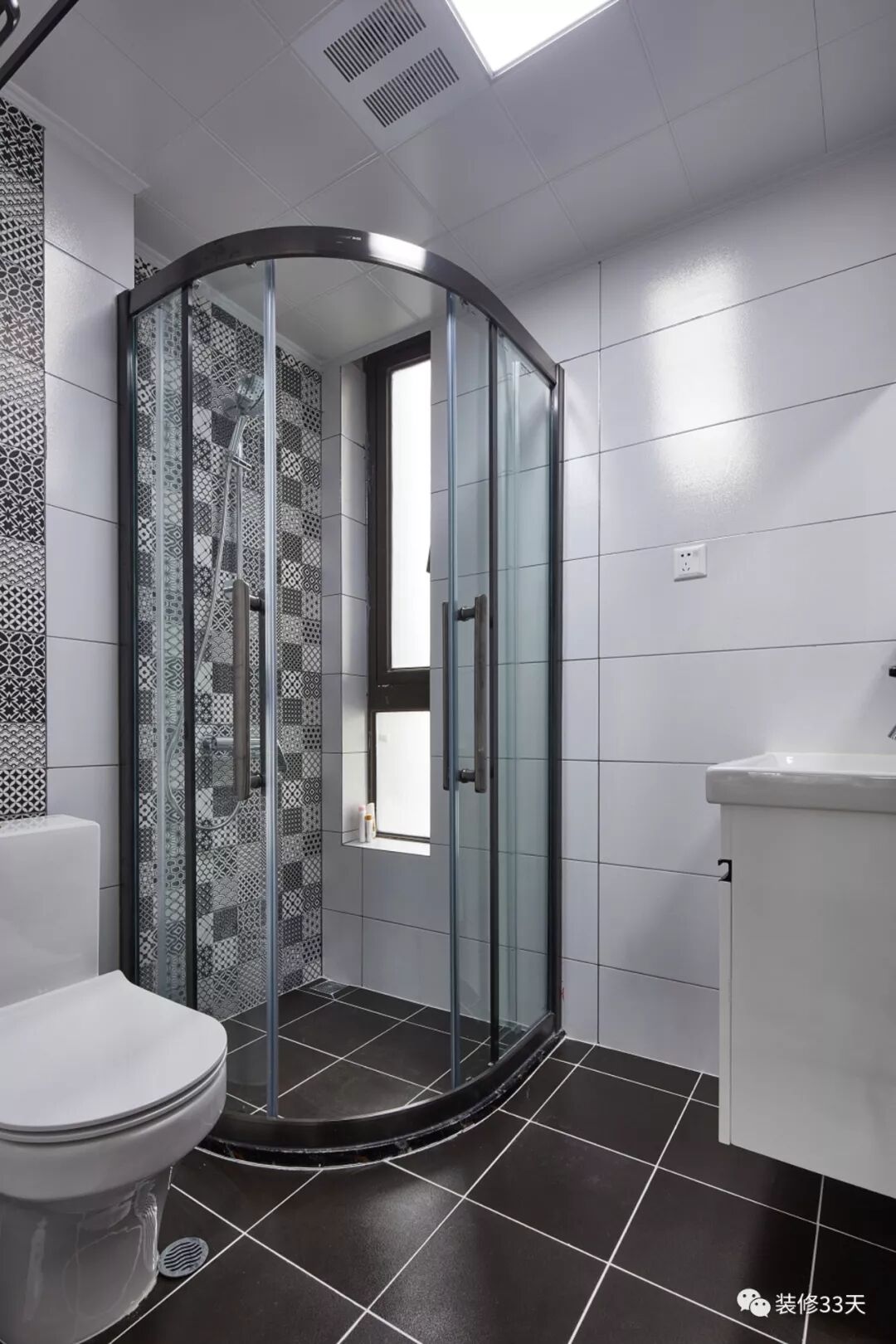 ▲ 主卫地面通铺黑色地砖,搭配白色墙面砖,局部采用花砖点缀背景,精致且显品位