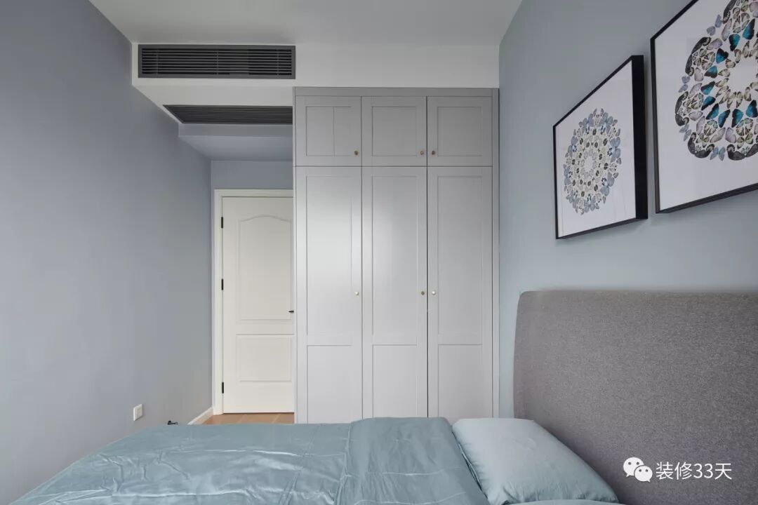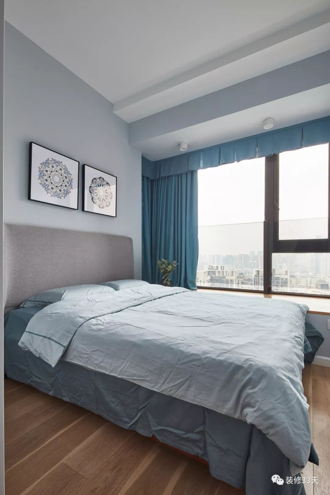 ▲ 次卧作父母房,灰色布艺床搭配蓝灰色背景,装饰两幅简框画点缀,蓝色窗帘与床品呼应,营造静谧就寝氛围