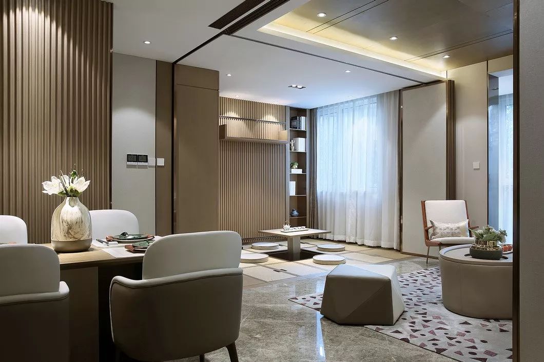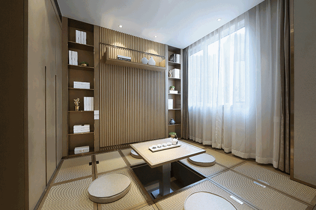 白天起居或会客时,客厅、聚会区完全打开,视觉上形成小户型很少有的宽大横厅之感。主人或与朋友在沙发区聊天,或在有升降桌的茶室品茶看书,满足年青父母的社交需求。升降桌下降后,整个榻榻米区又成了孩子玩耍翻滚的乐园,而大面积的榻榻米储藏空间则完美解决了全家的收纳需求。