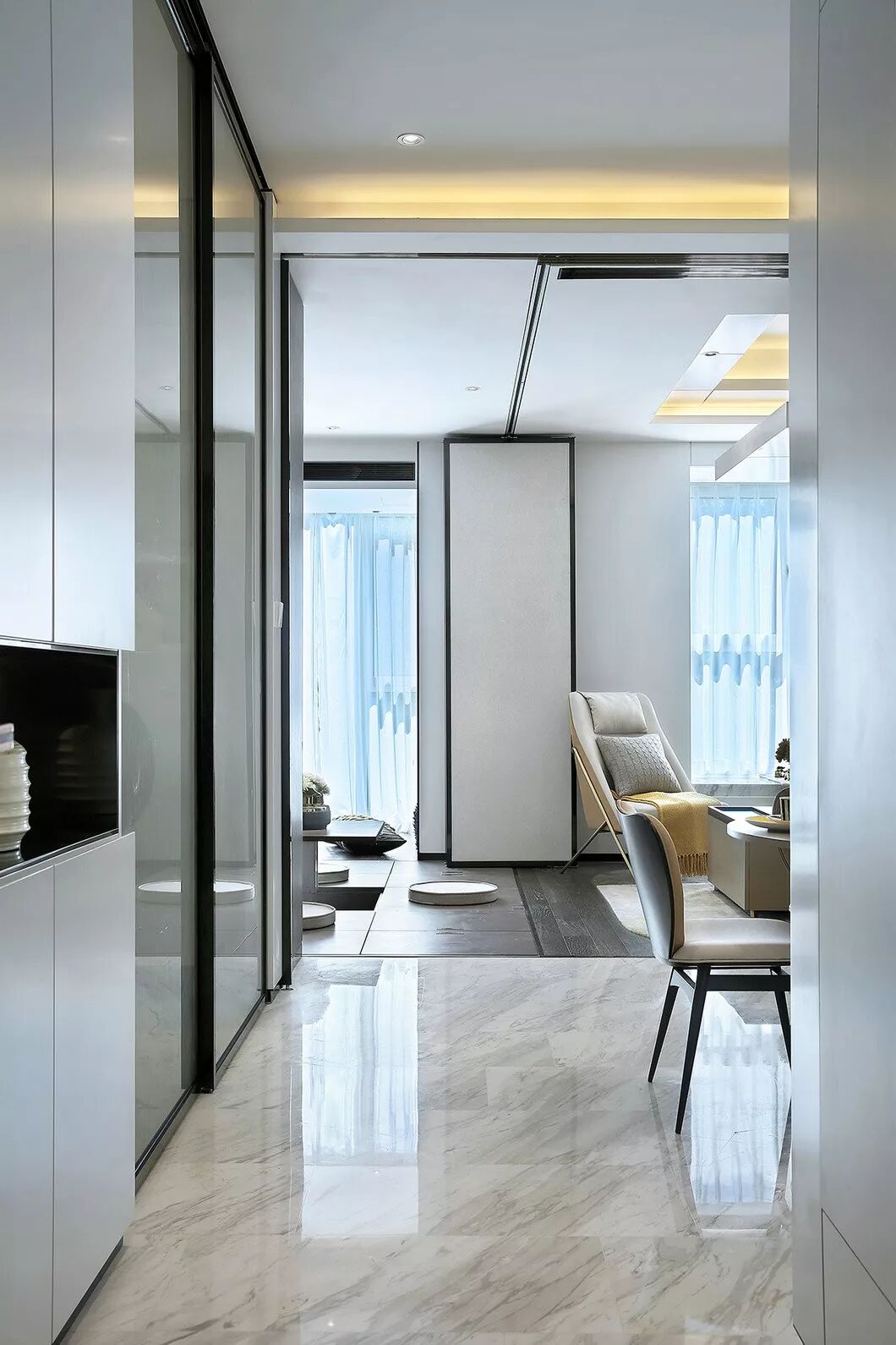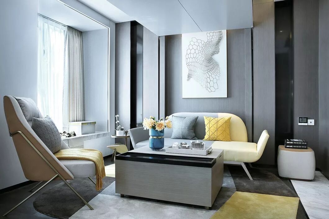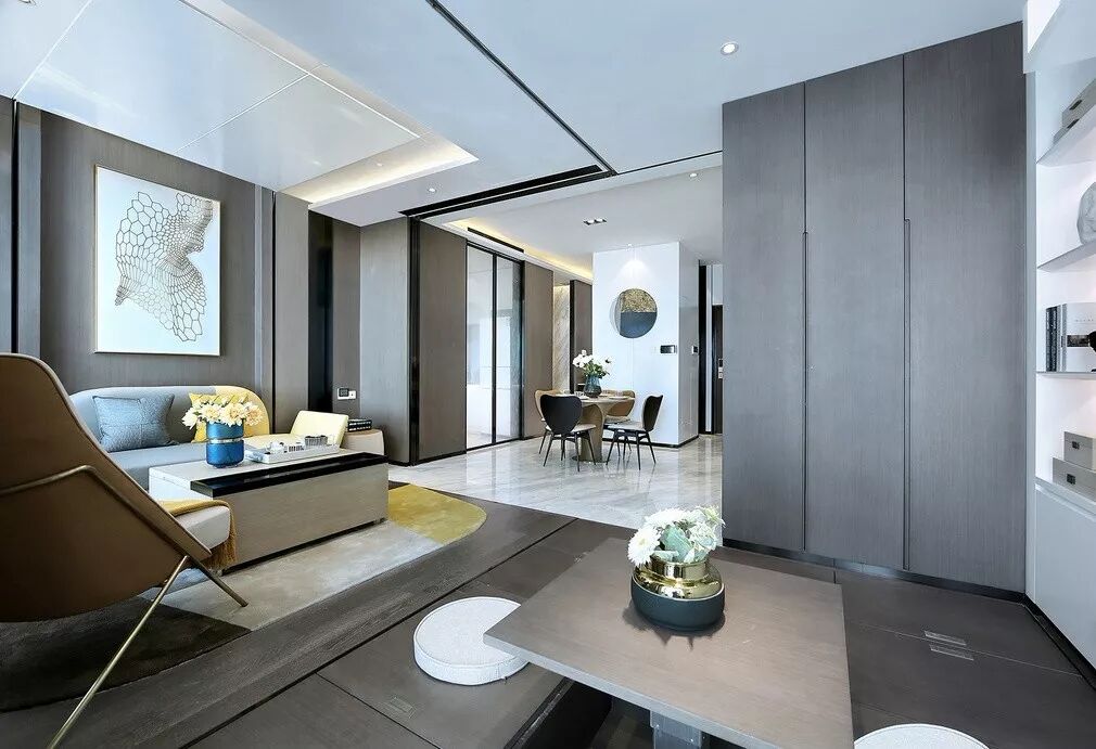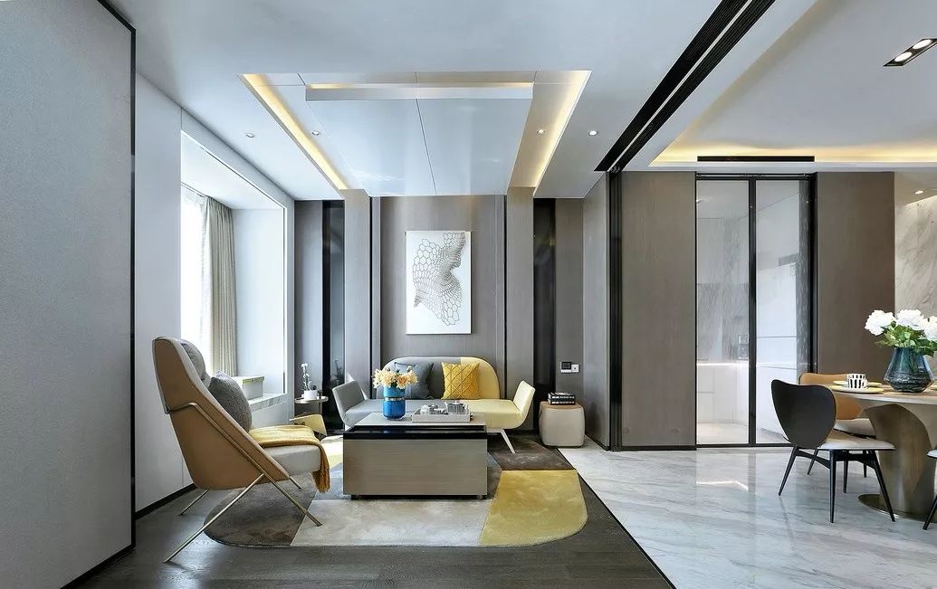 65户型立面以白烤漆和灰色木饰面为主材,运用一整面木饰面将客厅、厨房、卫生间的立面统一起来,使空间整体大气,爵士白和白烤漆的大面积使用,让空间显得纯粹而明亮,一抹亮黄点缀,极具现代感。