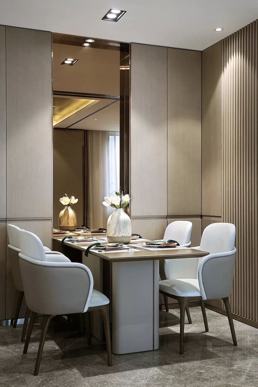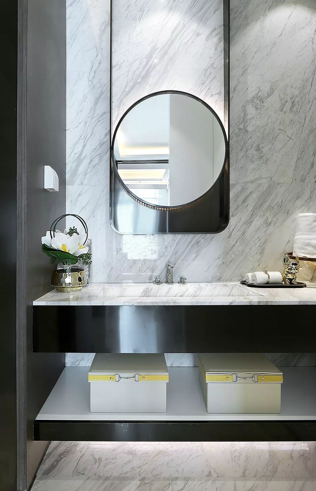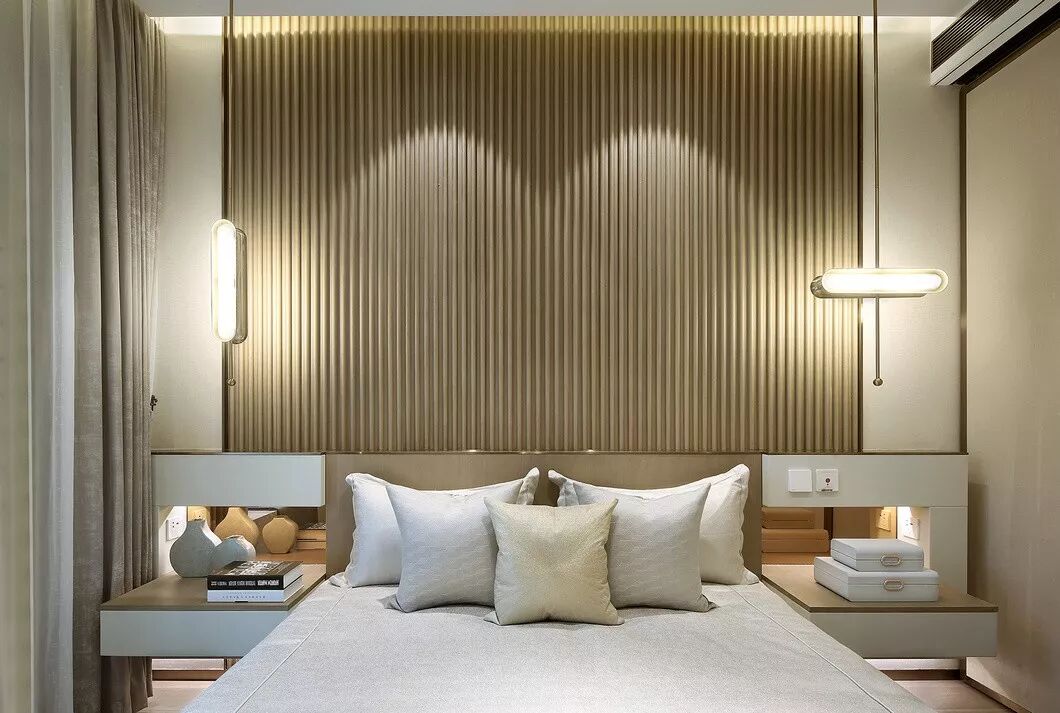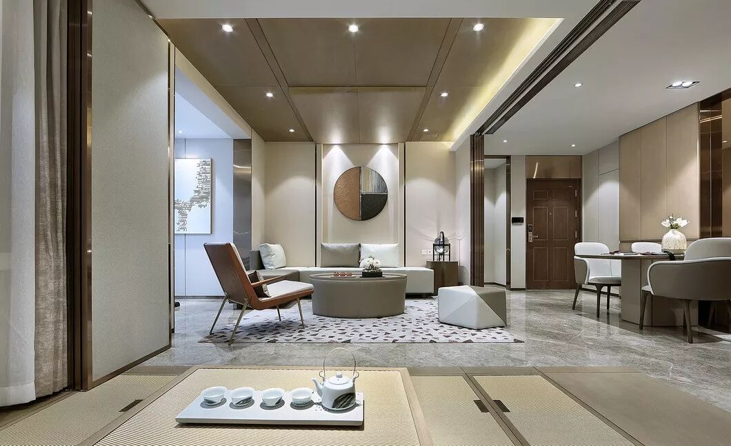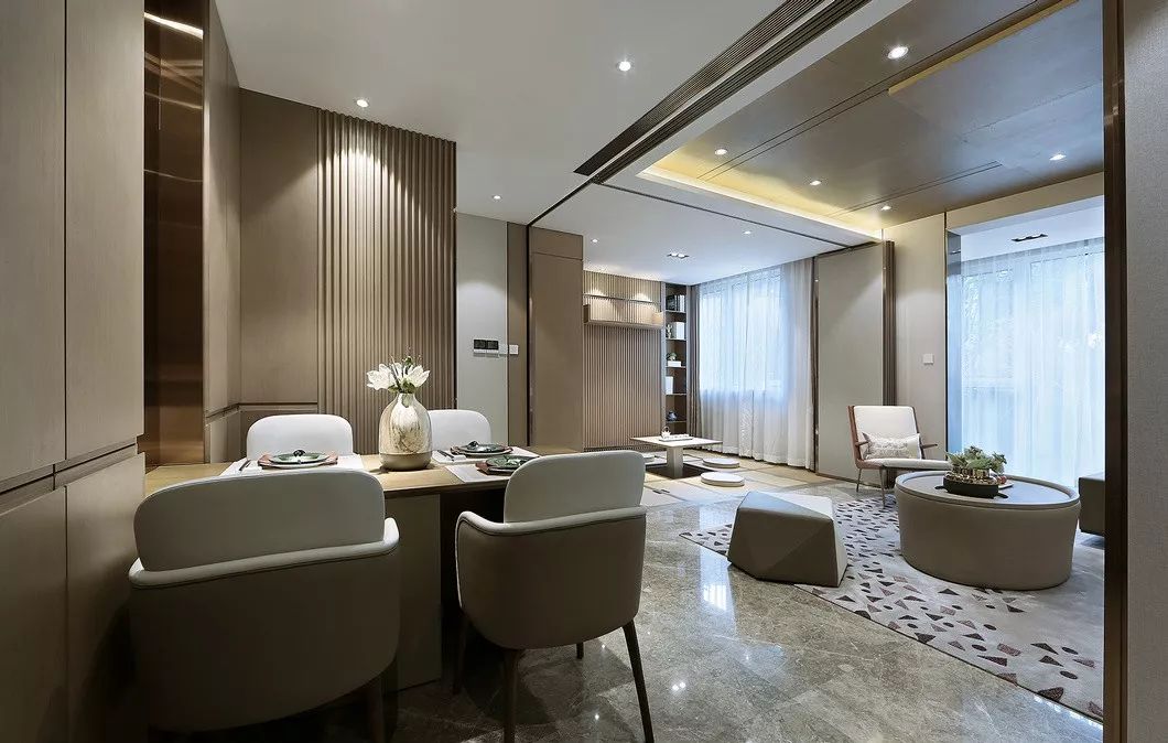 75户型设计得相对柔和温馨,融入当代东方的雅致,半柱形线条饰面,使空间简约而不缺乏细节,灰色皮质和咖钢传达出精致与品质。