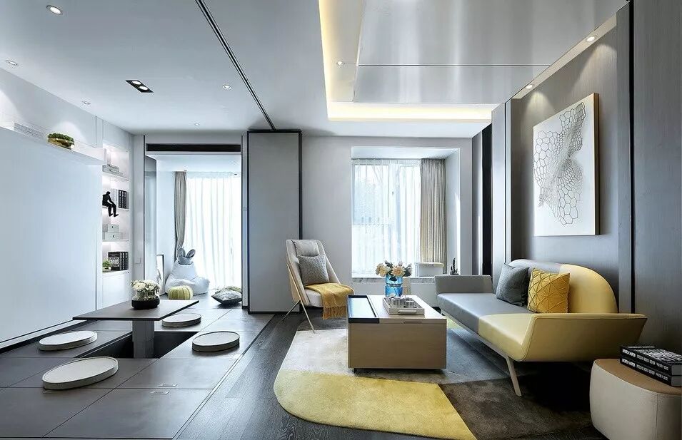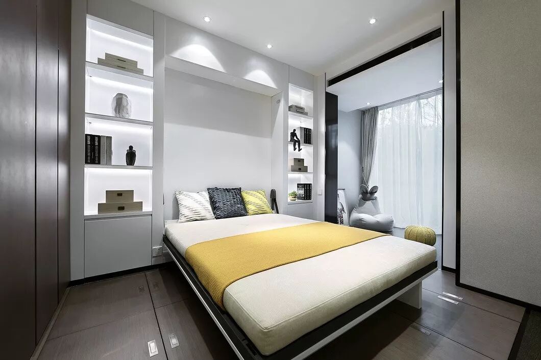 65户型亦是如此,翻下榻榻米区的床,通过折叠门形成主卧;降下沙发上方的床,通过移拉门形成客房。