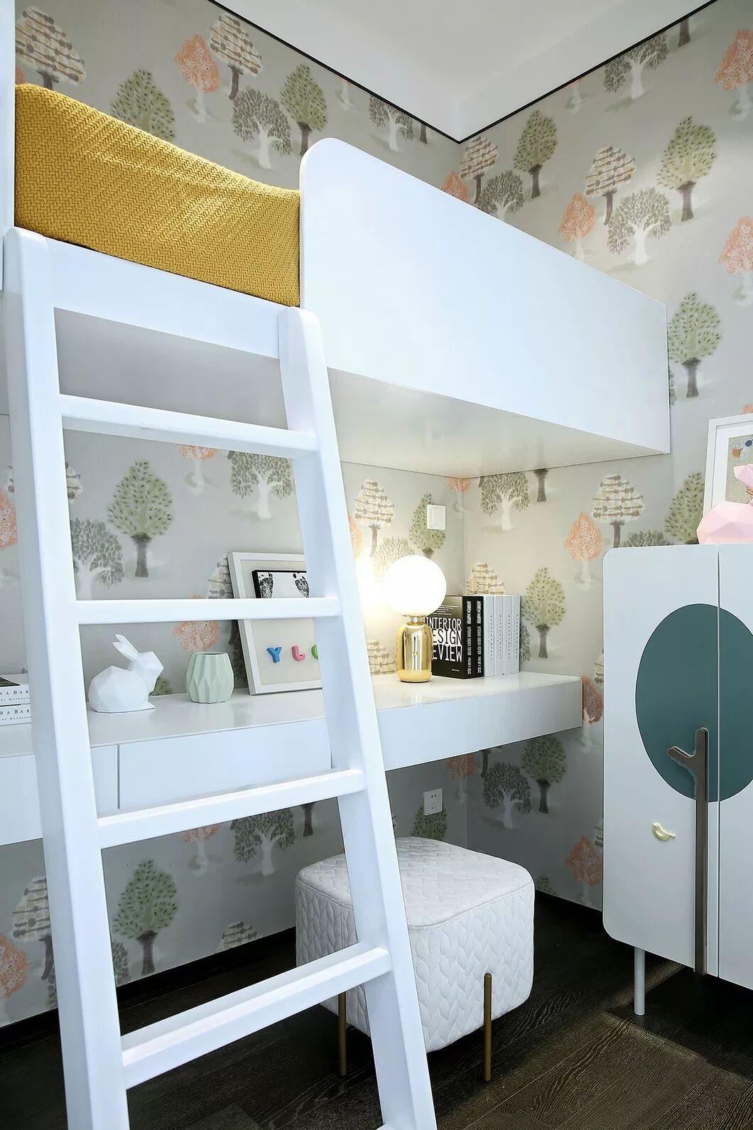 利用层高优势设置了底下书桌上面做床的儿童房,符合孩子活泼好动的天性,而半透明移拉门的设置又给了孩子躲猫猫的私密空间,也有利于父母看顾。