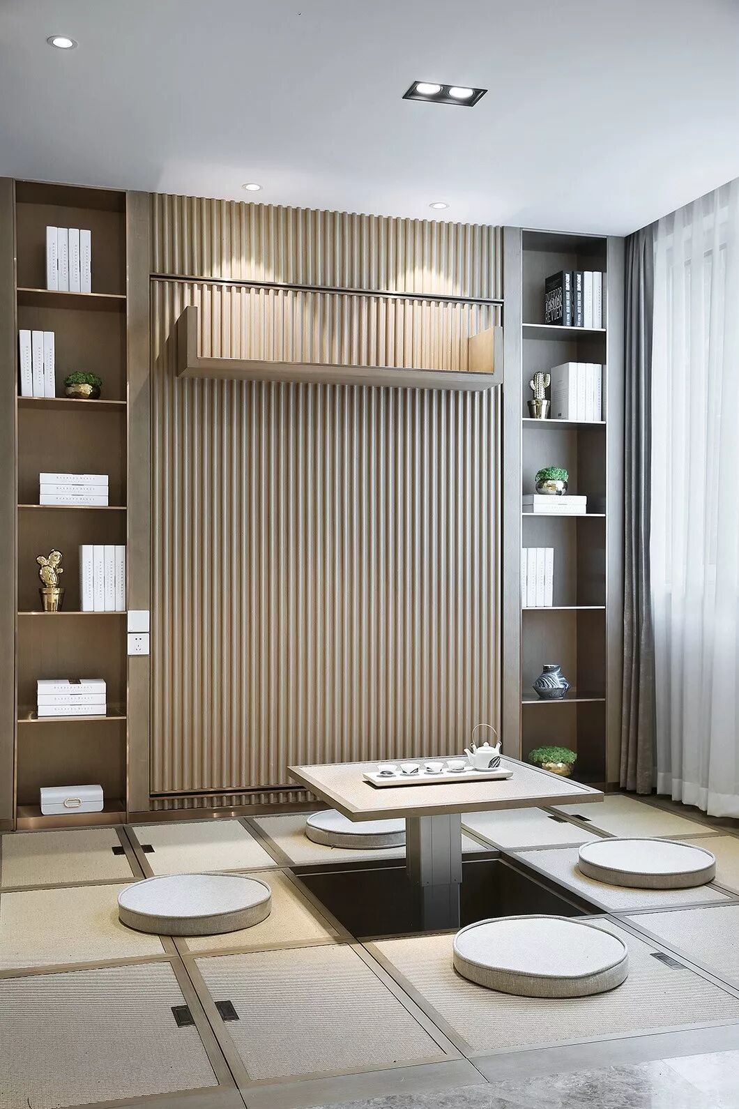 建筑层高3.3米,为充分利用层高,在书房兼休闲茶室区域各层降板0.45米,地面形成带有储藏功能的榻榻米区。而与之相邻的客厅则在吊顶内暗藏升降床,从而形成两个区域的顶、地完全平齐,消除高差。