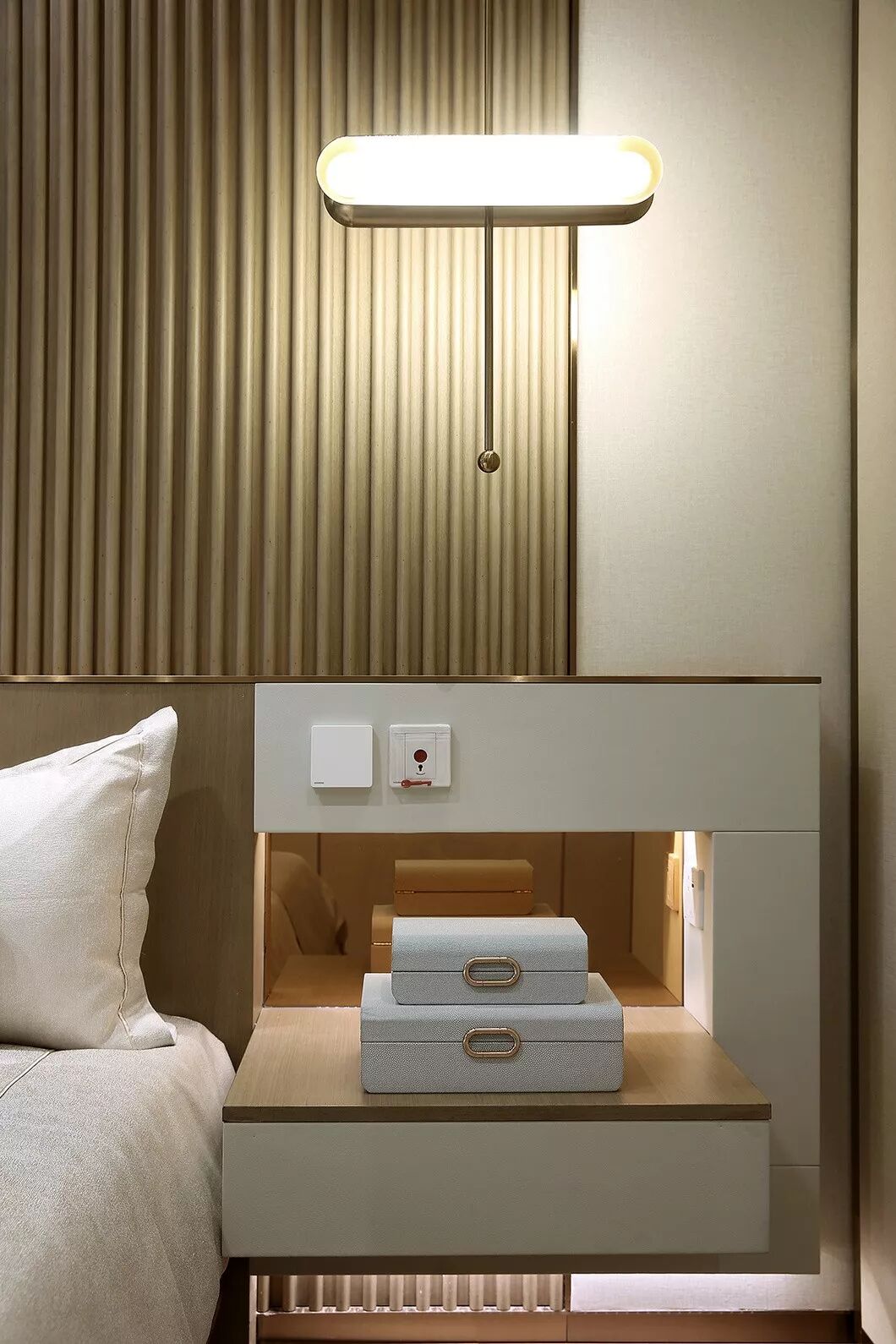 75户型原有一间卧室作为主卧,当夜晚休息时,拉开榻榻米区的折叠门,翻下书柜的暗藏床,则有了儿童房,当老人来照看孩子时,在拉上客餐厅间的移拉门,降下客厅沙发上方的升降床,又有了客房。