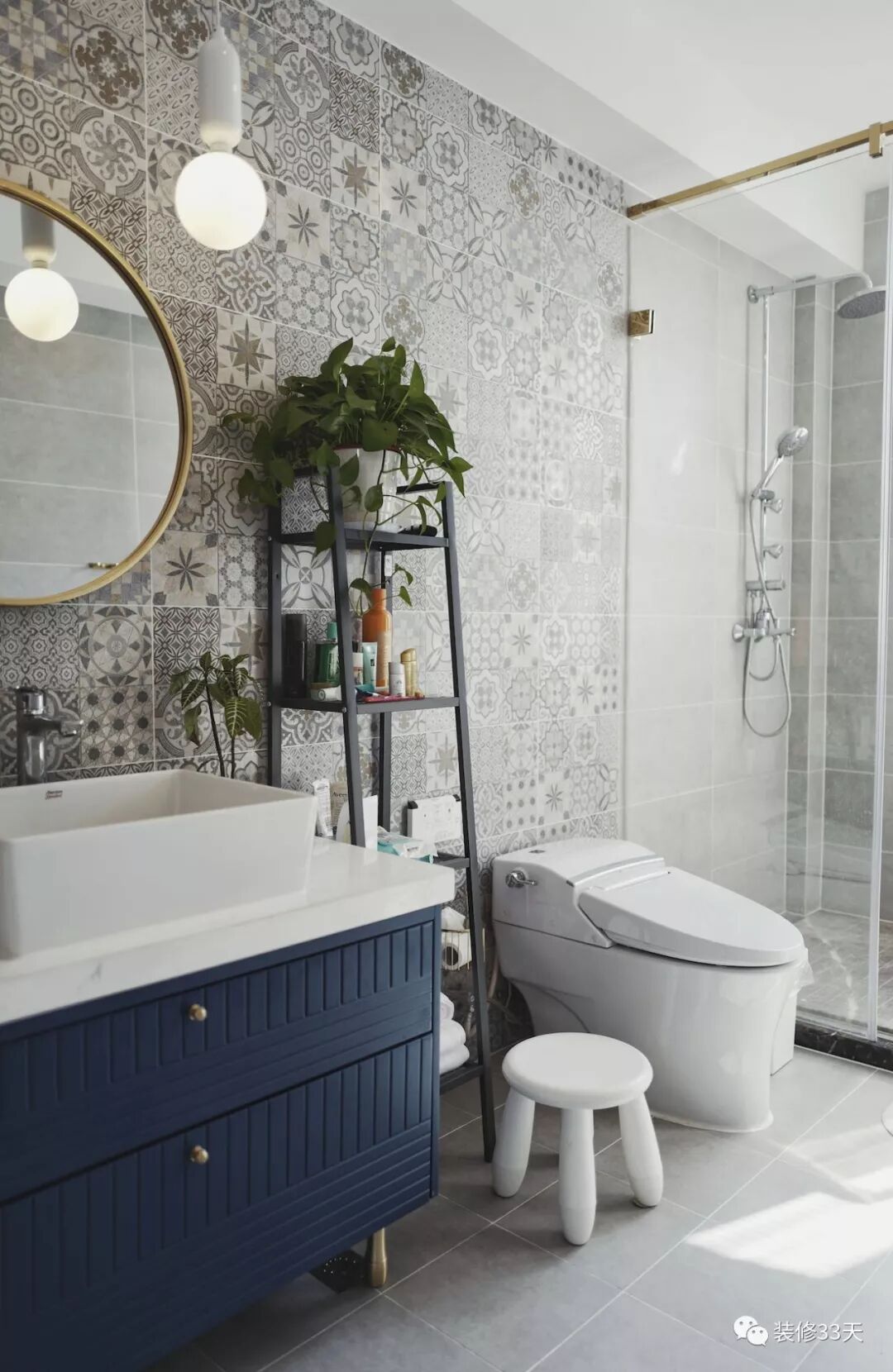 ▲ 客卫选择灰色花砖铺贴出背景,金色圆镜与蓝色台盆柜搭配,延续次卧的现代时尚感