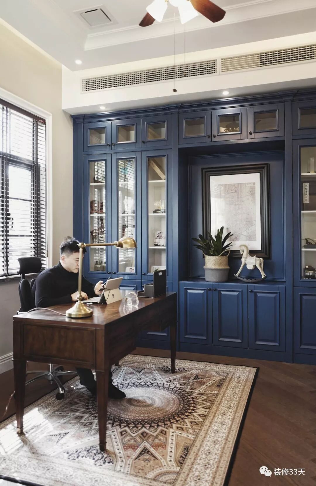 ▲ 书房空间整体色调沉稳,赋有品位与质感,蓝色储物柜体作背景墙,兼具美观与实用性