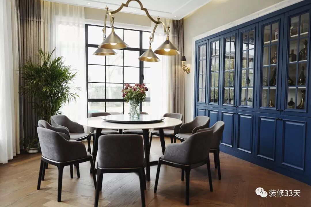 ▲ 大圆桌搭配铜质吊灯,赋有质感,入墙设计大面积储物柜,蓝色玻璃柜门轻盈通透