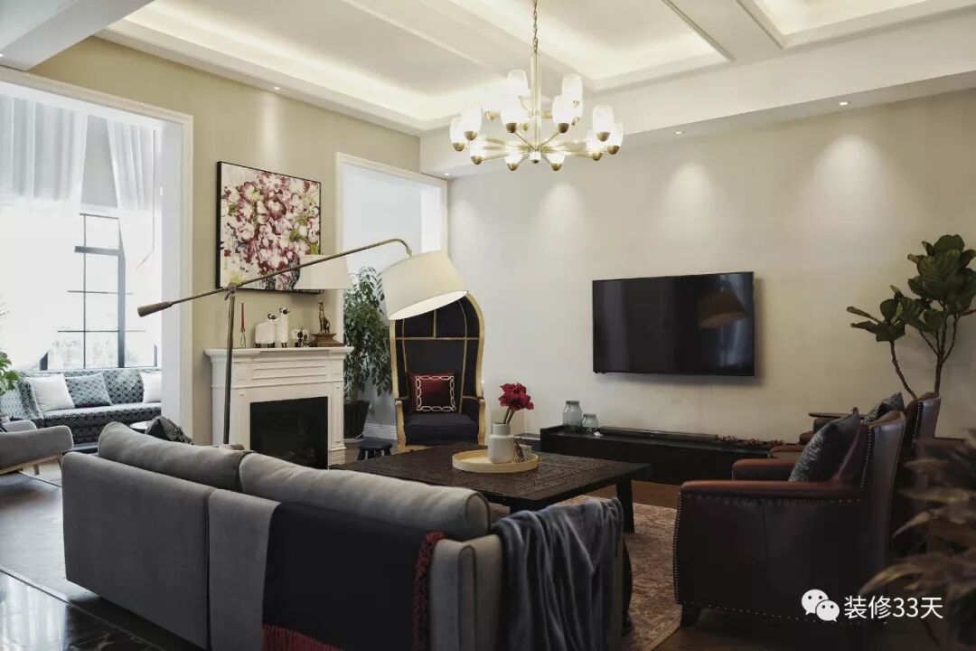 ▲ 正厅家具选择以现代布艺为主,柔和并增加亲近感,壁炉的设置为居家增添暖意