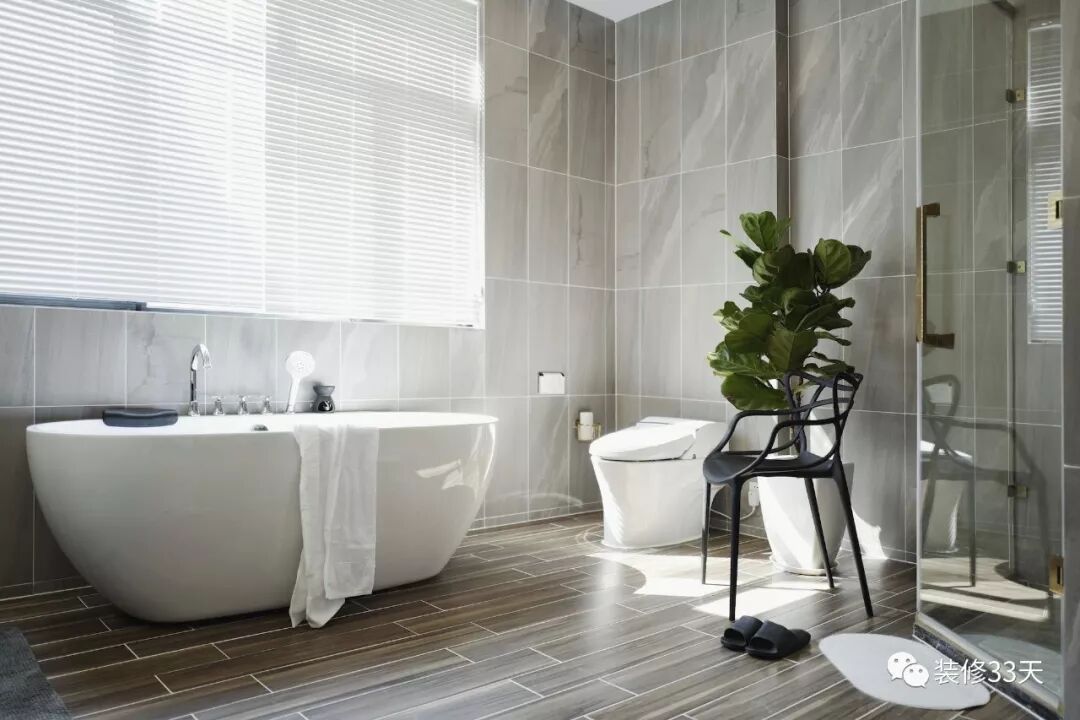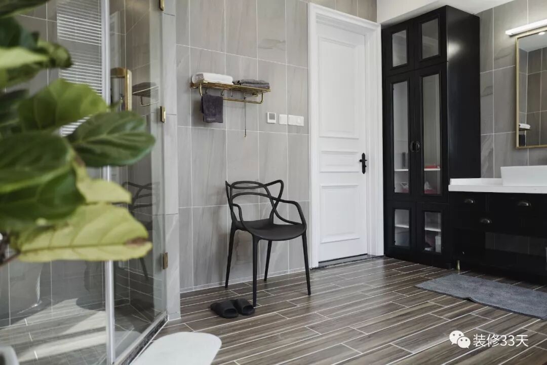 ▲ 主卫地面通铺地板砖加白色美缝,灰砖墙面搭配灰色元素家具,个性神秘并具实用性