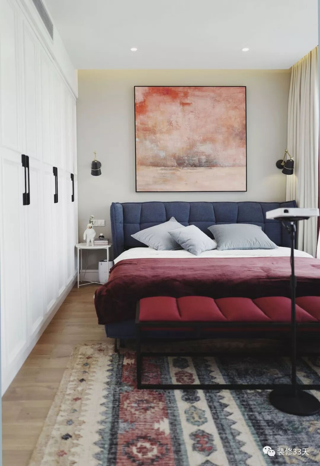 ▲ 次卧是业主夫妻的卧室,以红蓝为主色调,大海,沙滩,红日,打造酒店度假风的睡眠空间