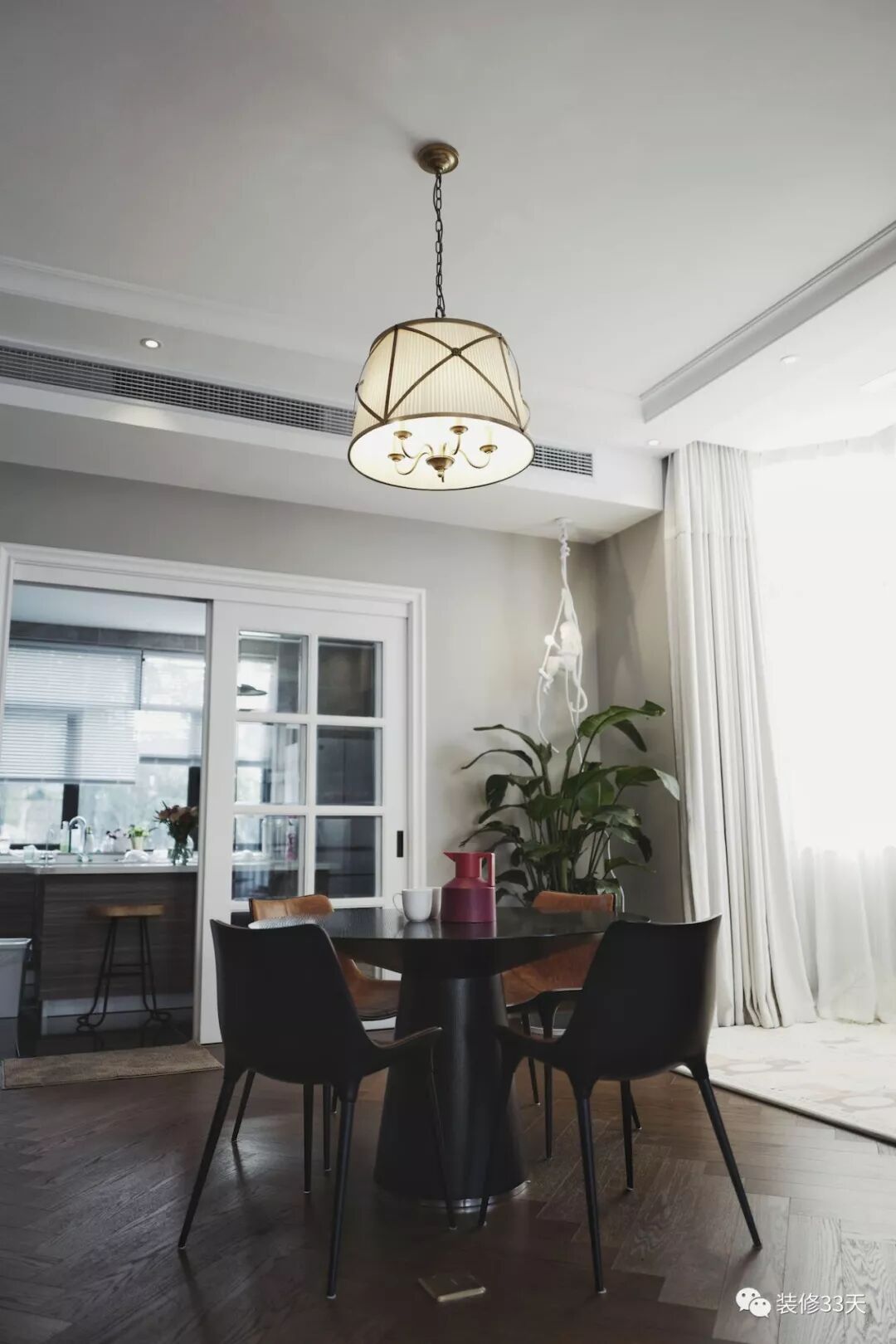 ▲ 间餐厅与厨房相邻,一张小圆桌搭配美式吊灯,一角的猴子吊灯增活跃气氛