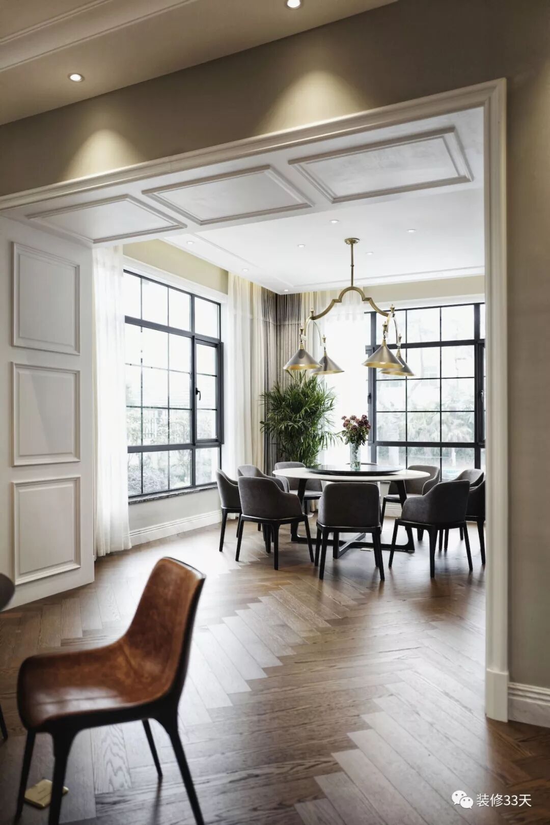 ▲ 正餐厅地面人字拼双色木地板,线条造型宽垭口,两面采光窗映出室外绿景