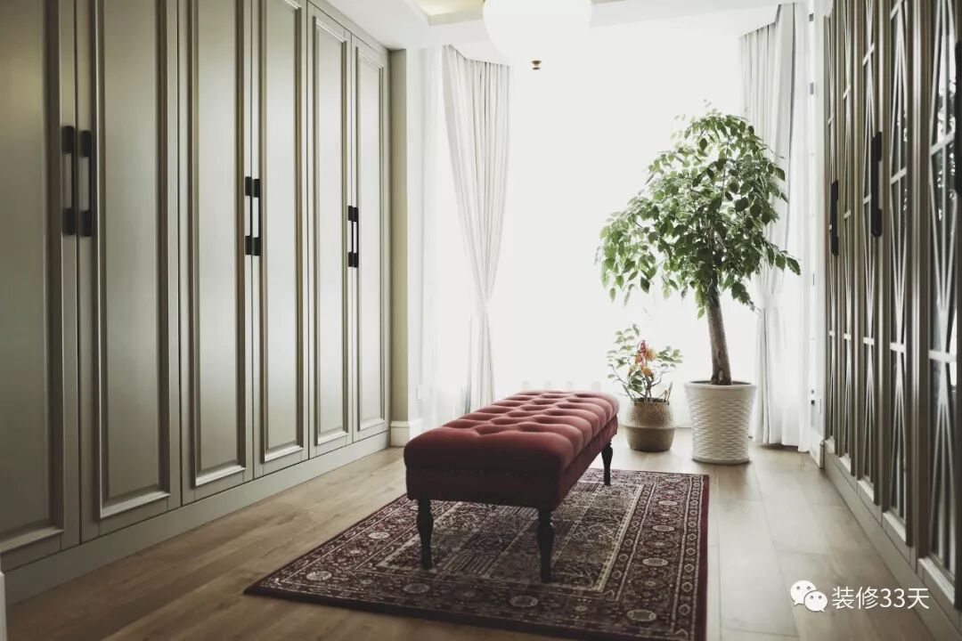 ▲ 另一侧则是简约美式线条大衣柜,红色长凳搭配绿植,低调赋有质感