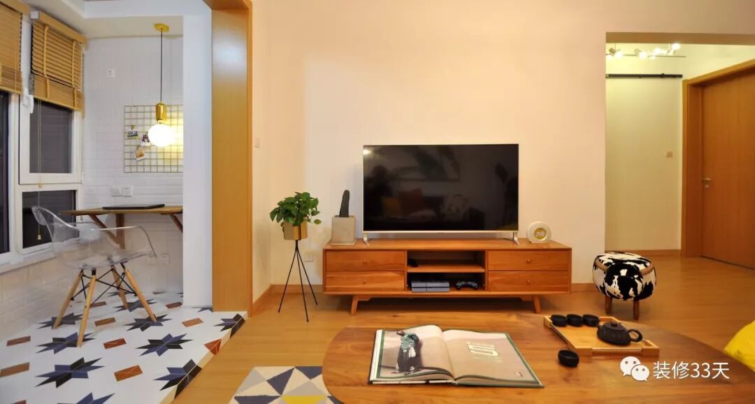 ▲ 留白电视背景墙,原木电视柜搭配绿植即是一景,错落地台铺贴花砖增添活跃气氛,利用阳台改造出一个休闲办公区