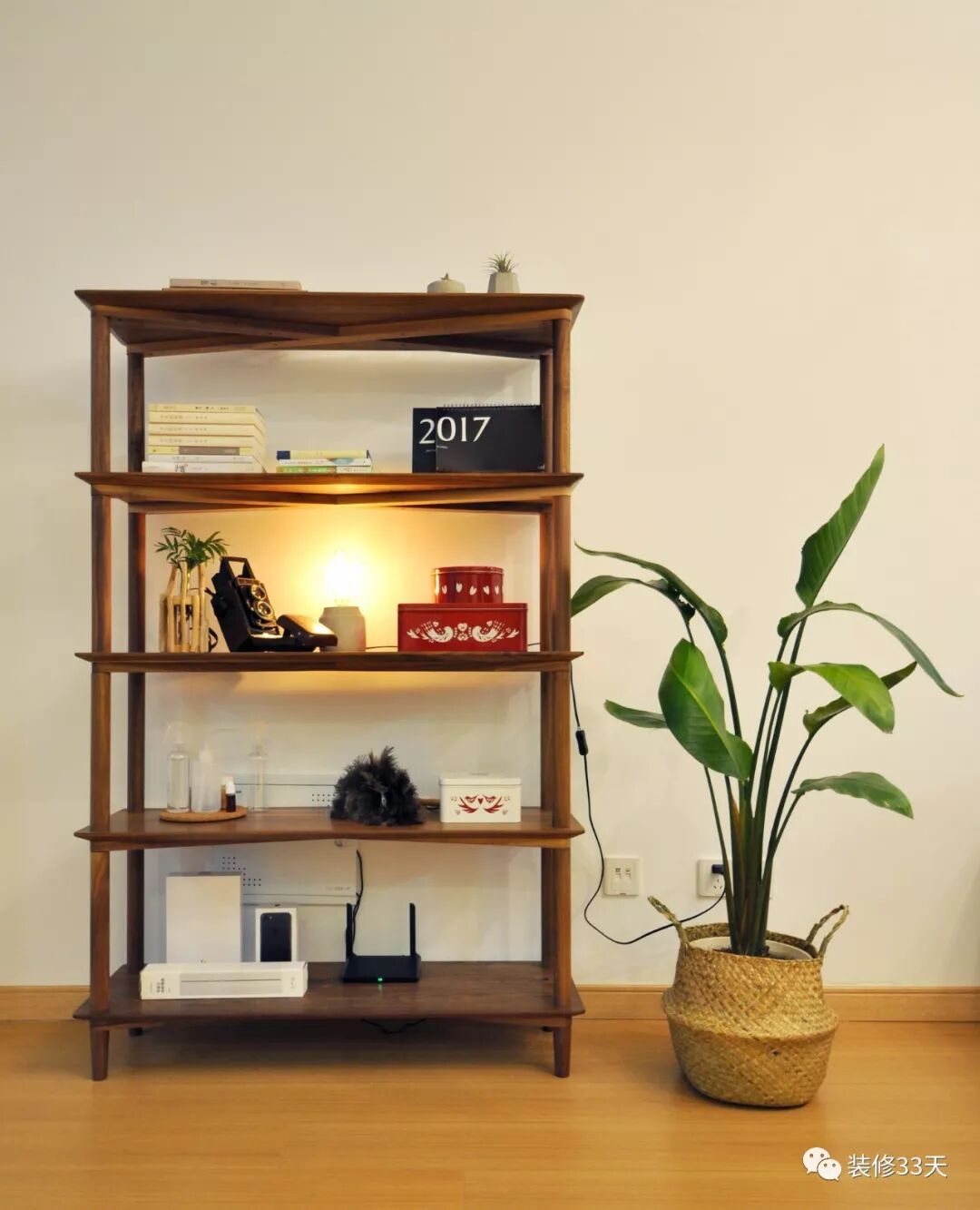 ▲ 沙发一侧的原木层板置物架,可以放置书籍和装饰物,一个装饰灯给空间增添温暖,营造气氛