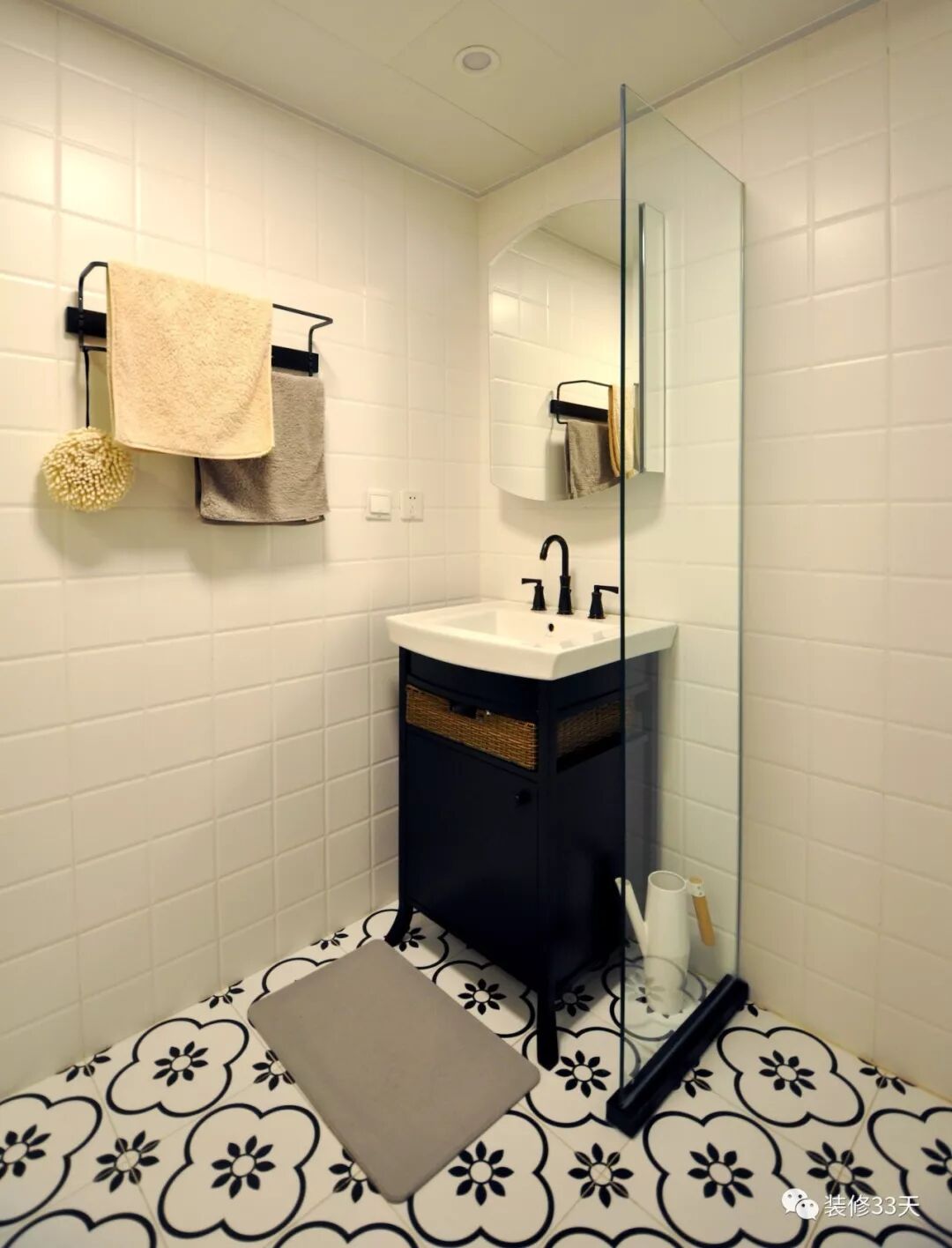 ▲ 卫生间地面铺设花砖,墙面铺贴白色小方砖,黑色浴室柜搭配黑色五金件,呈现出一个精致个性的卫浴空间