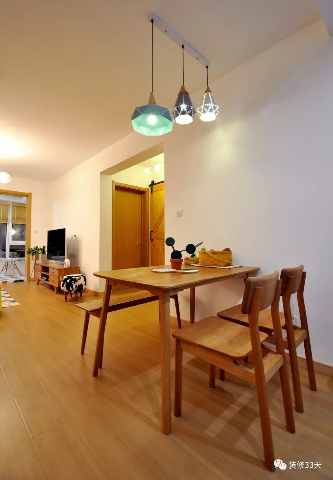 ▲ 空间的局限,简化餐厅功能,一套原木餐桌椅搭配长凳,节省空间,马卡龙色吊灯增添色彩的同时营造出温馨就餐环境