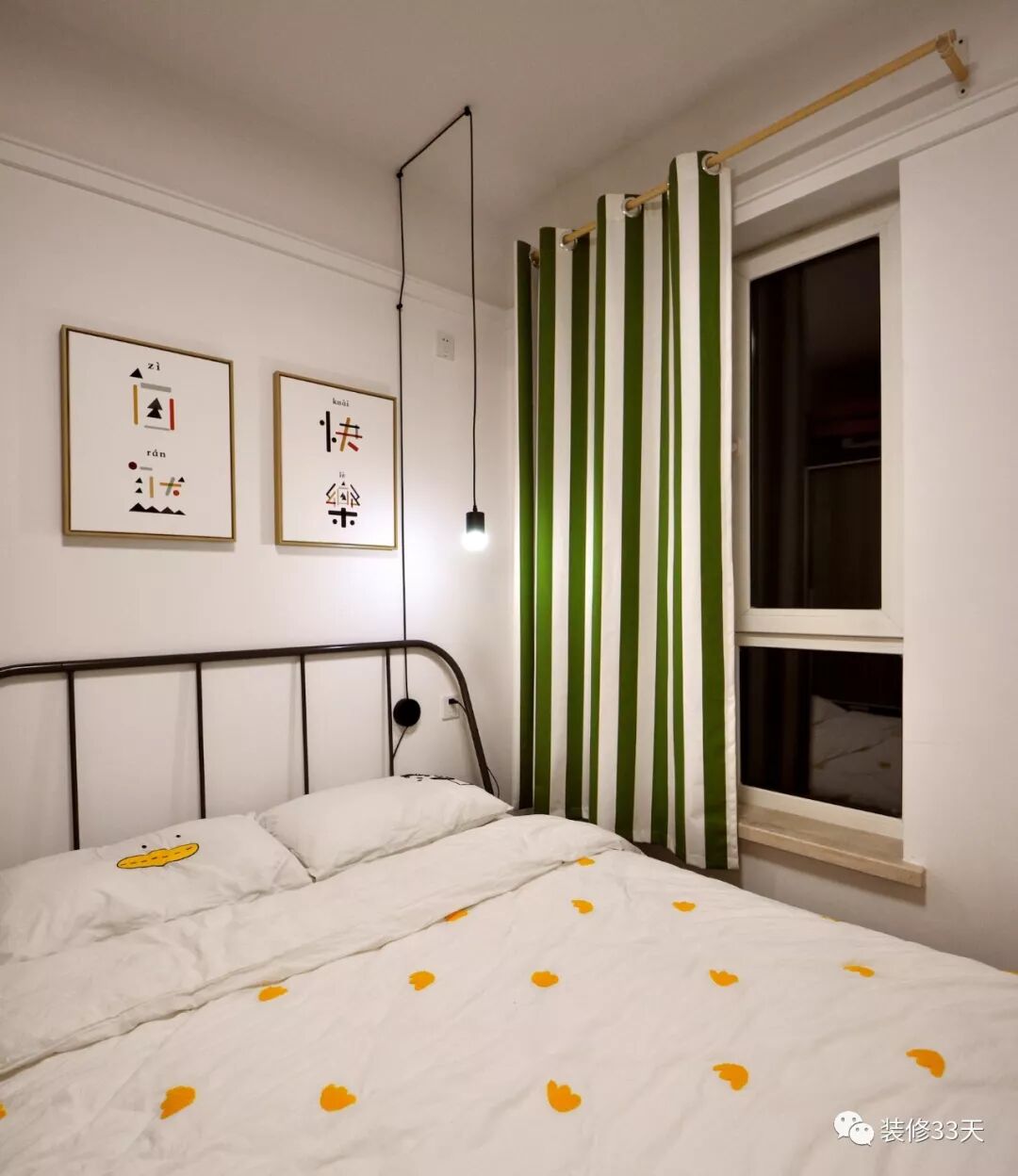 ▲ 儿童房清新简约,黑色铁艺床,背景墙挂“自然”与“快乐”的装饰画,明装吊灯,个性有趣,绿色竖条窗帘,养眼整洁