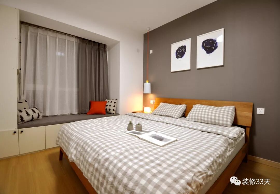 ▲ 主卧以灰白为主色调,搭配木色家具,无印风的床品,飘窗为卧室增添一处休闲场域