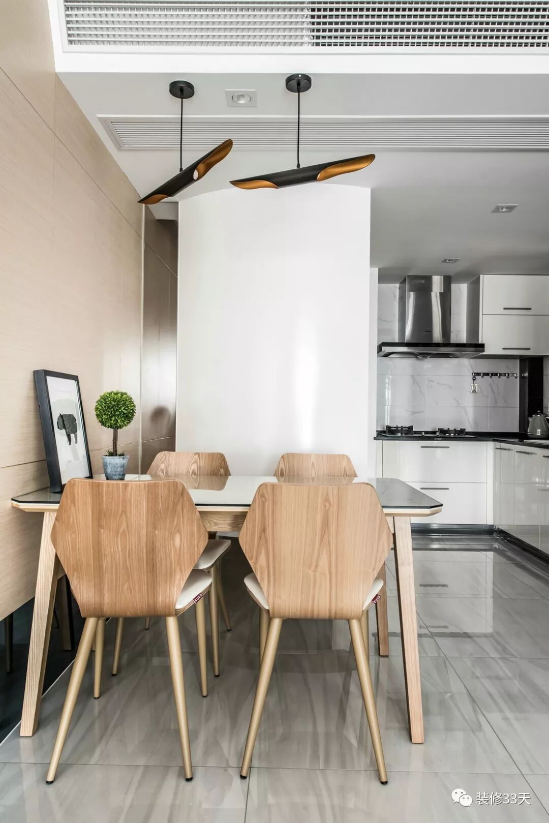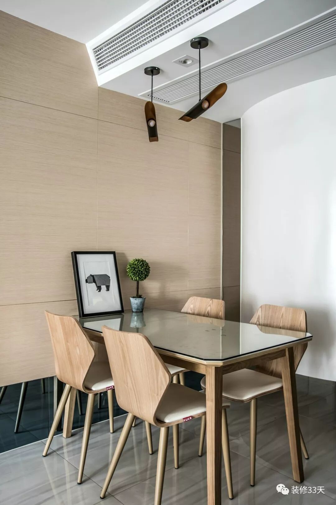 ▲ 一套现代风餐桌椅靠木饰面背景,靠近地面用灰玻点缀,延伸视觉