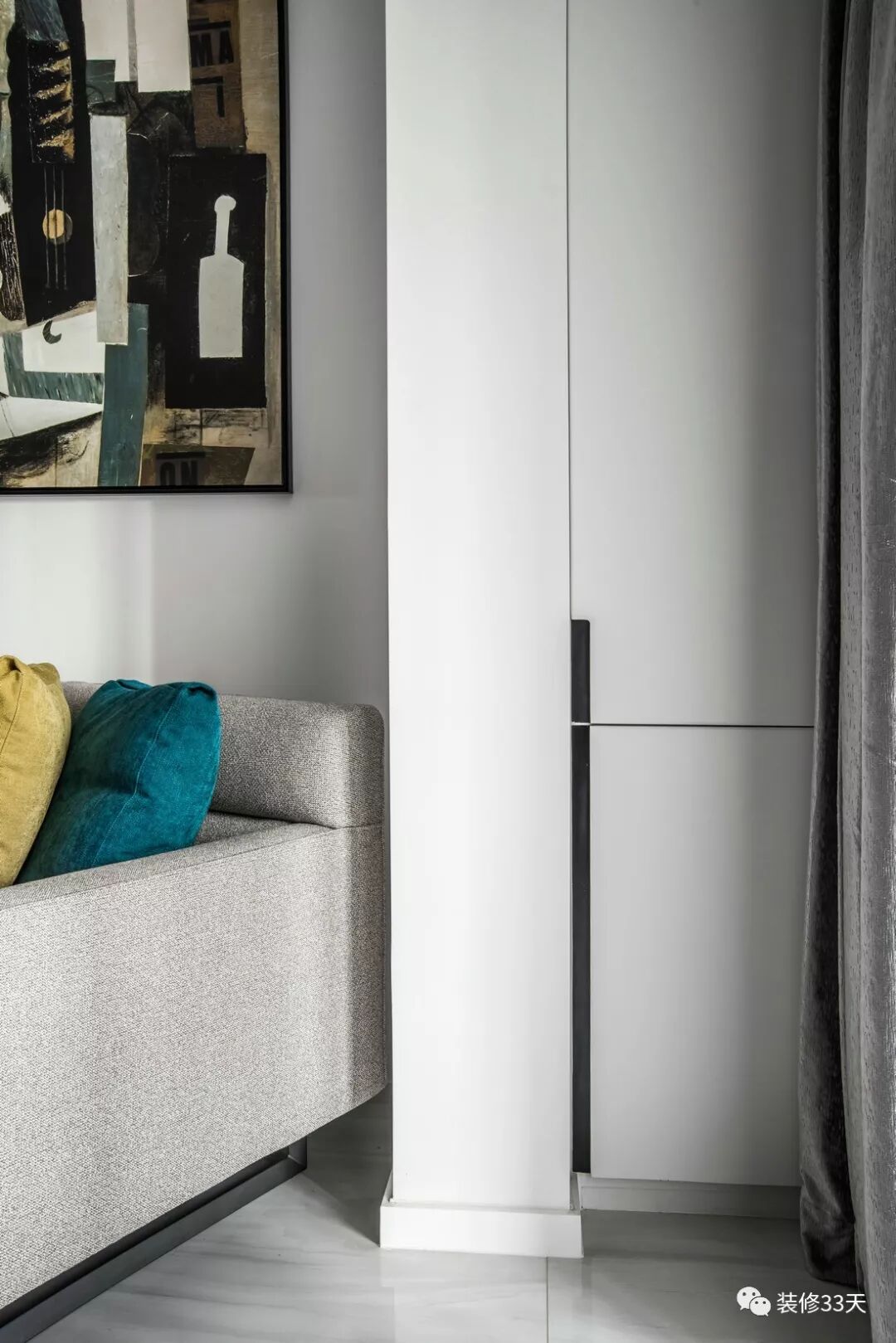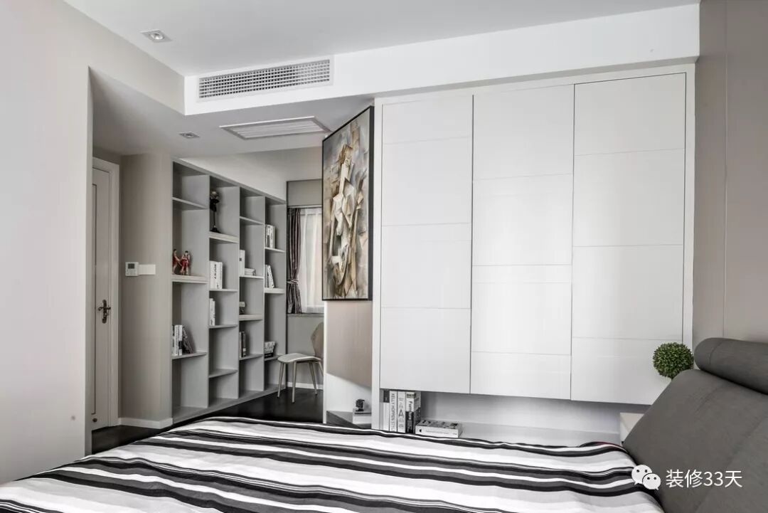 ▲ 床侧设计大衣柜,部分斜切墙面点缀装饰画,底部留空作置物收纳层