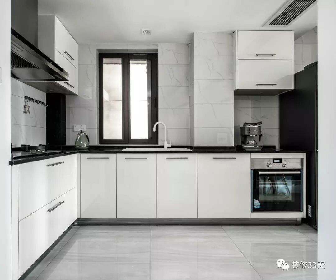 ▲ 开放式厨房让空间变得更开阔,黑白定制橱柜搭配仿石纹瓷砖,简约干净