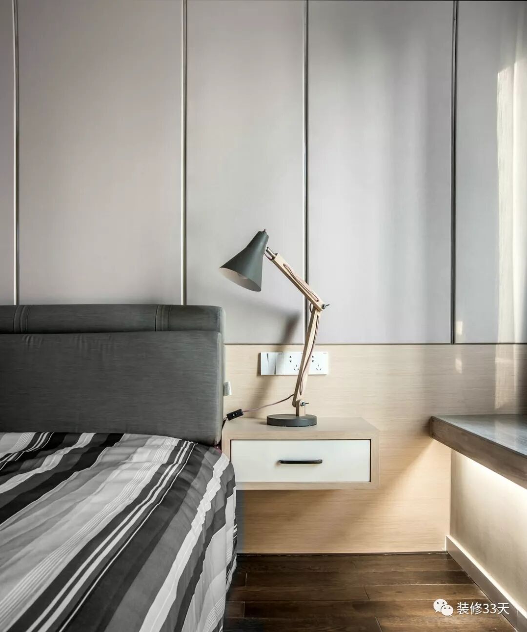 ▲ 主卧灰色硬包结合木饰面作背景,连接木作悬空床头柜,整体气质干练
