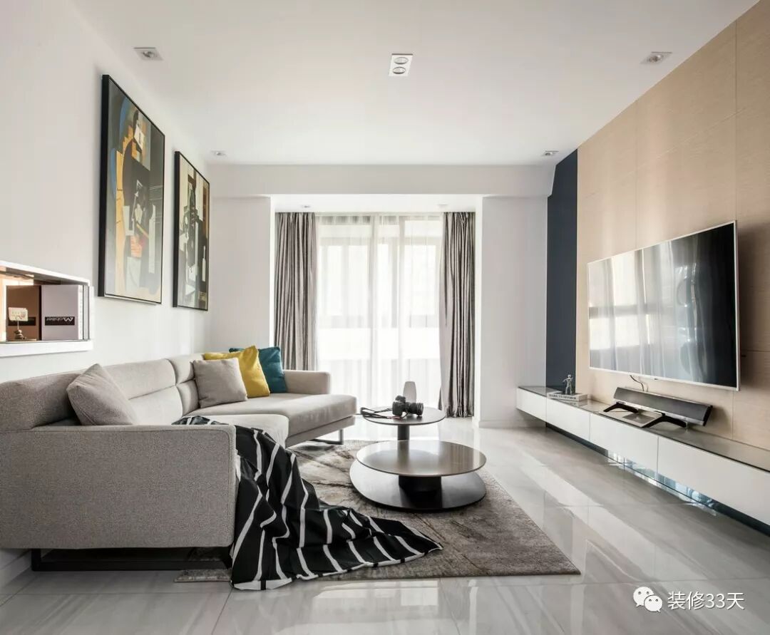 ▲ 一张布艺沙发搭配圆形造型茶几,白色乳胶漆墙面用两幅装饰画点缀,靠走廊一边设计茶镜书架,相邻木饰面隐藏儿童房的门片