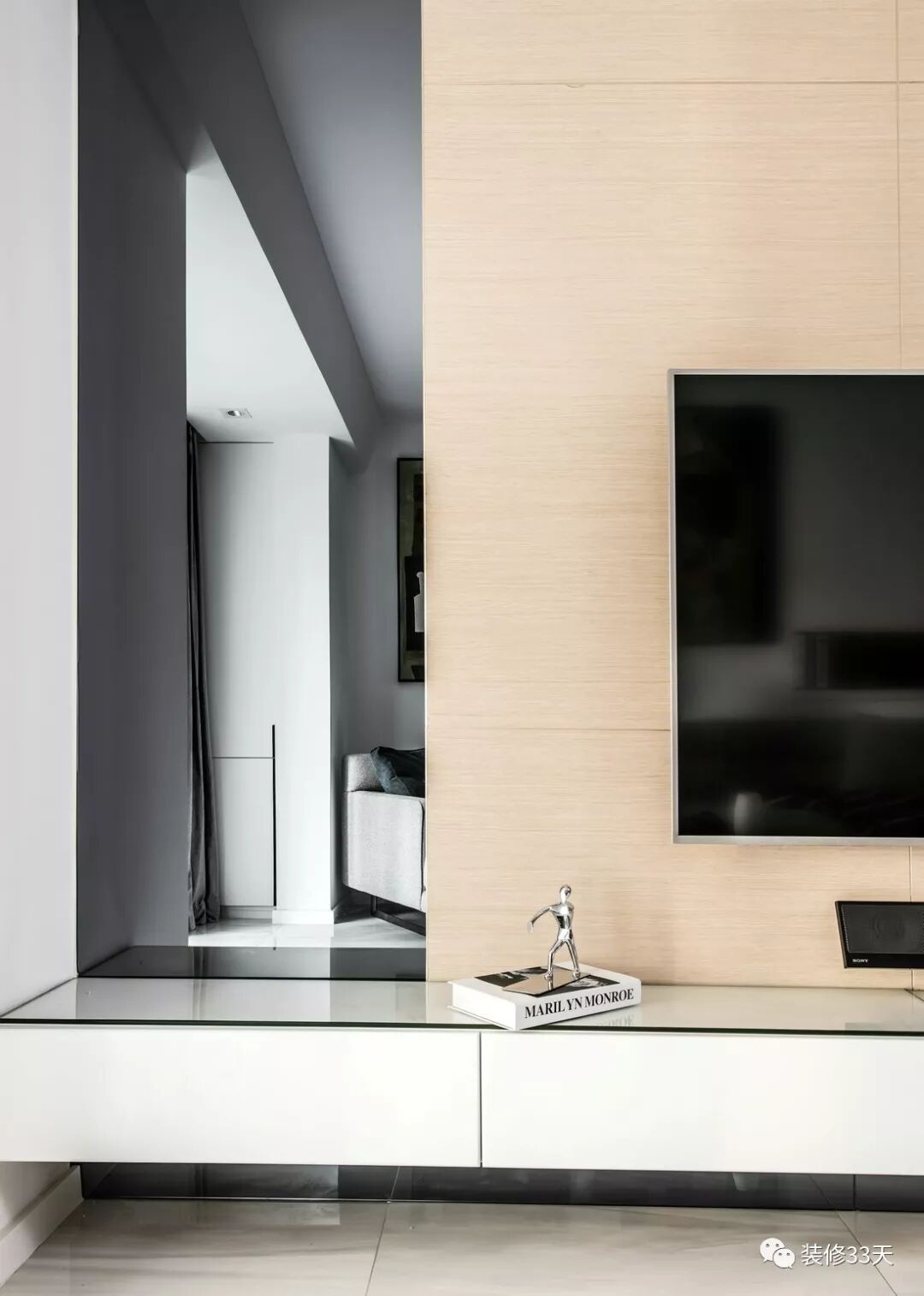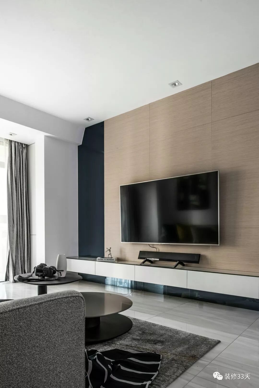 ▲ 电视背景墙延续餐厅的木饰面作背景,木作架空式电视柜
