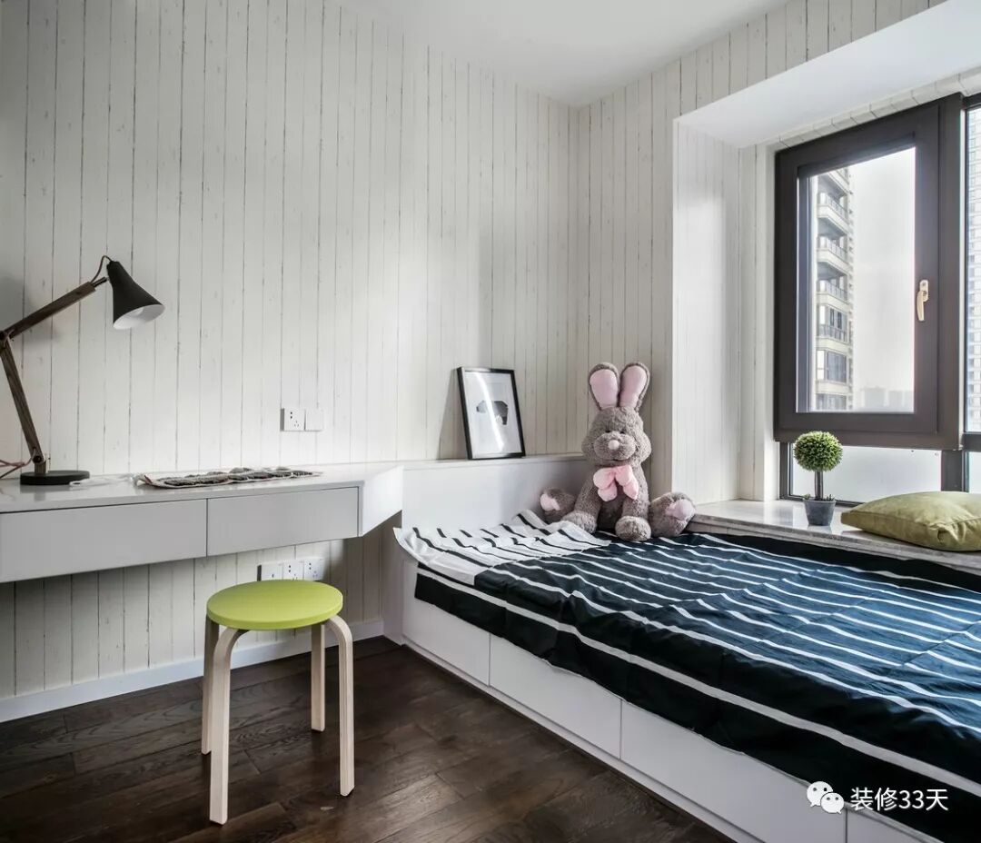 ▲ 儿童房通铺深色地板,墙面通铺浅色竖条纹壁纸,木作榻榻米床架与书桌连接