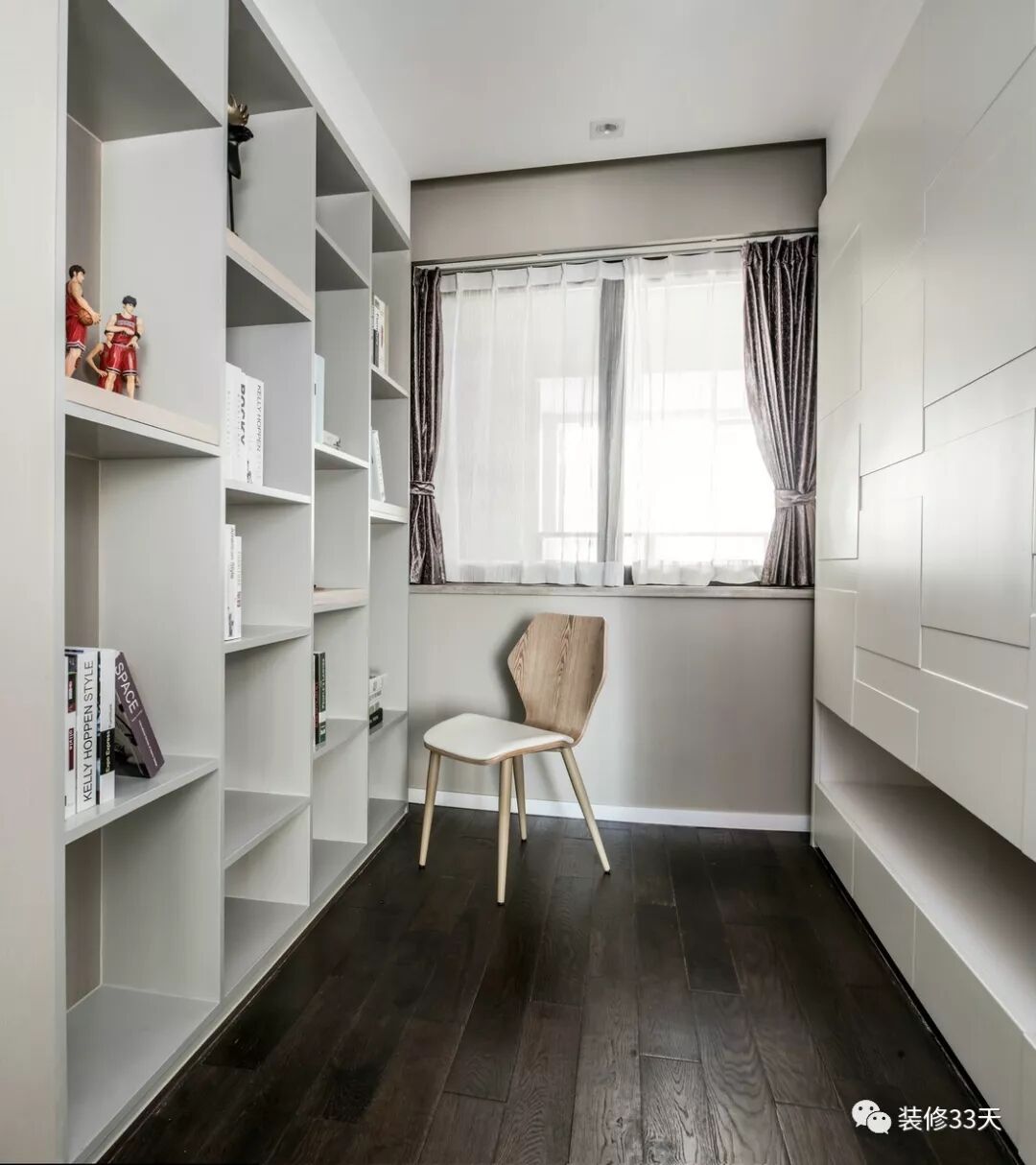 ▲ 主卧设计转角衣柜结合与步入式书房,开放式错落书架作背景,与柜体门片纹理呼应