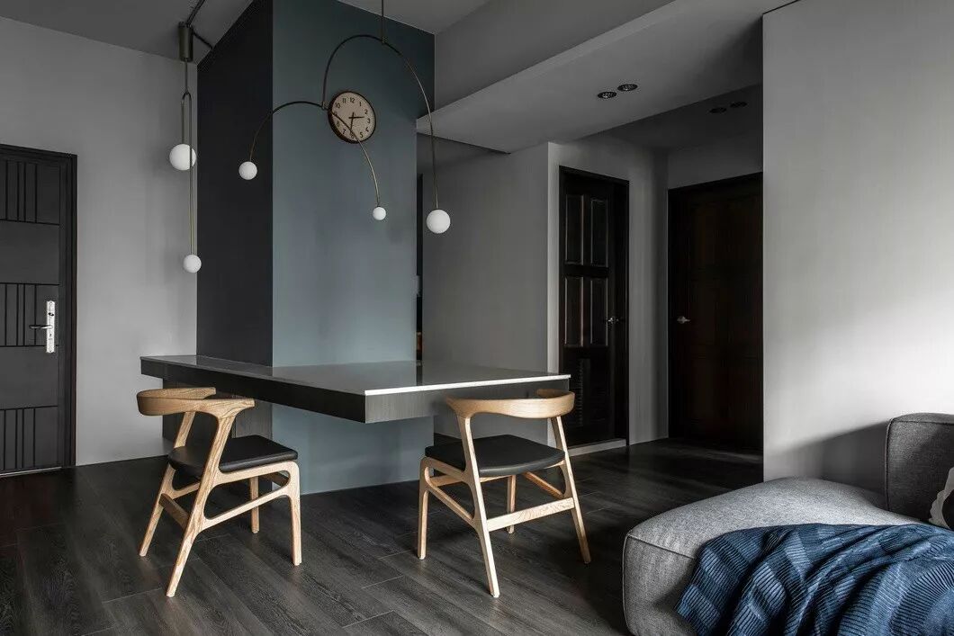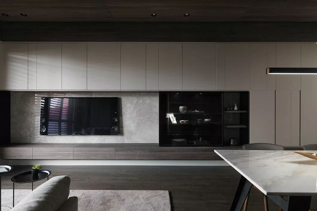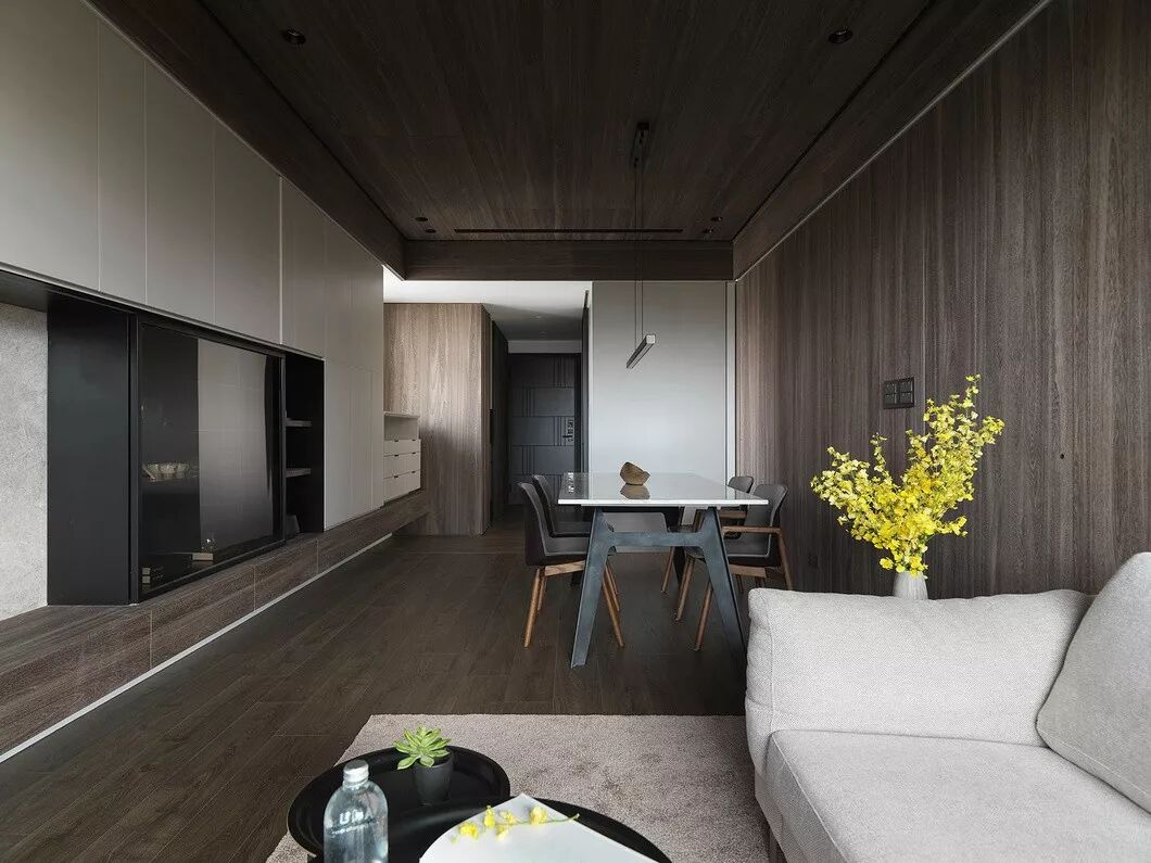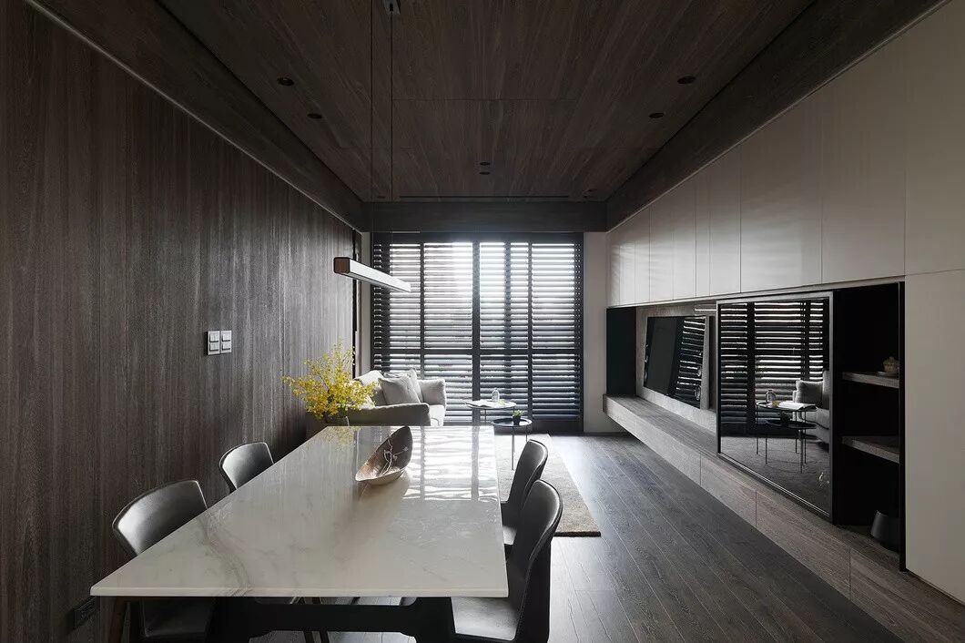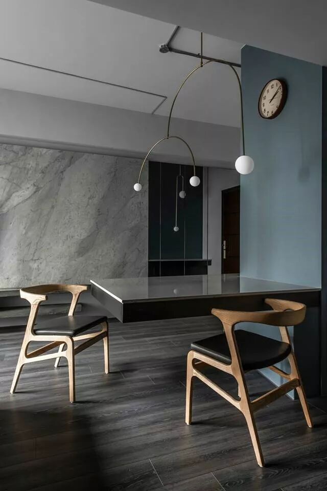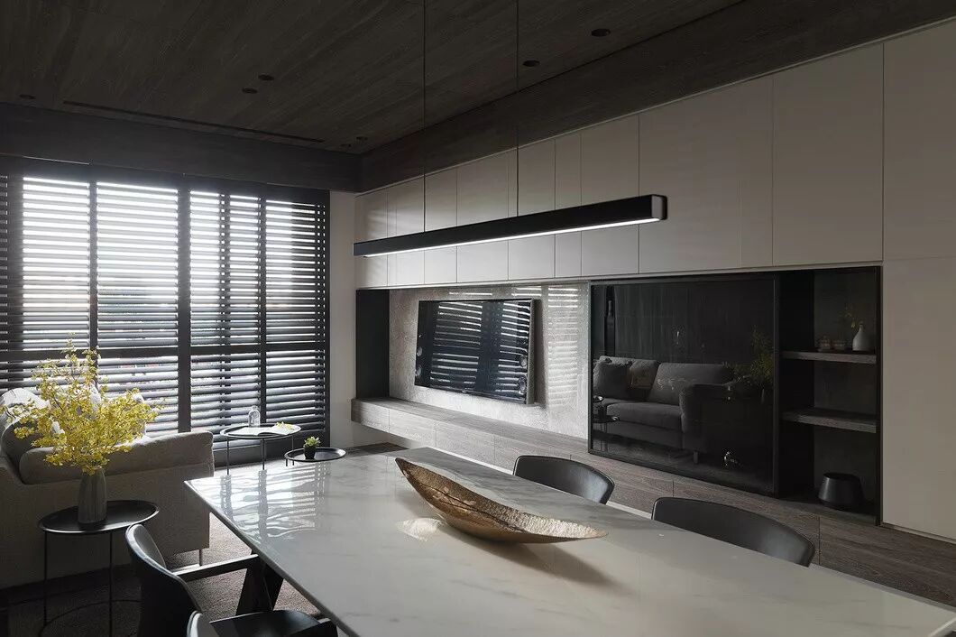 在这个案例中我们于狭长形的客-餐厅空间设计了一张自玄关开始延伸的中岛式大餐桌为了使空间在视觉上更为宽阔我们将餐桌做了悬臂的结构设计没有桌脚餐桌的长向斜边为空间中的重要轴线贯穿整体设计自玄关进入后餐桌- 电视墙水泥台面-天花板带状条灯同时平行于此轴线上除了空间方向性的暗示外也借此打破成规的垂直水平