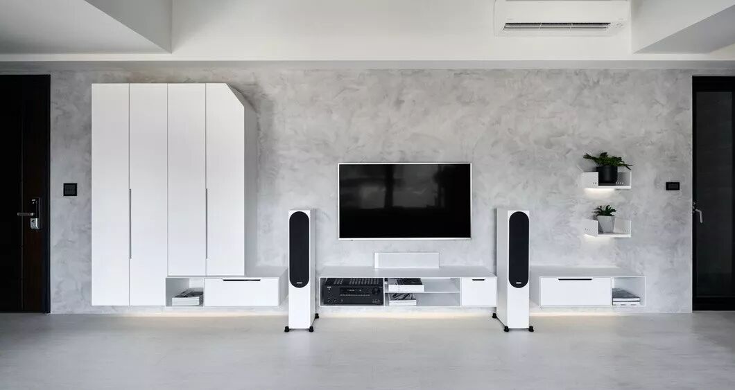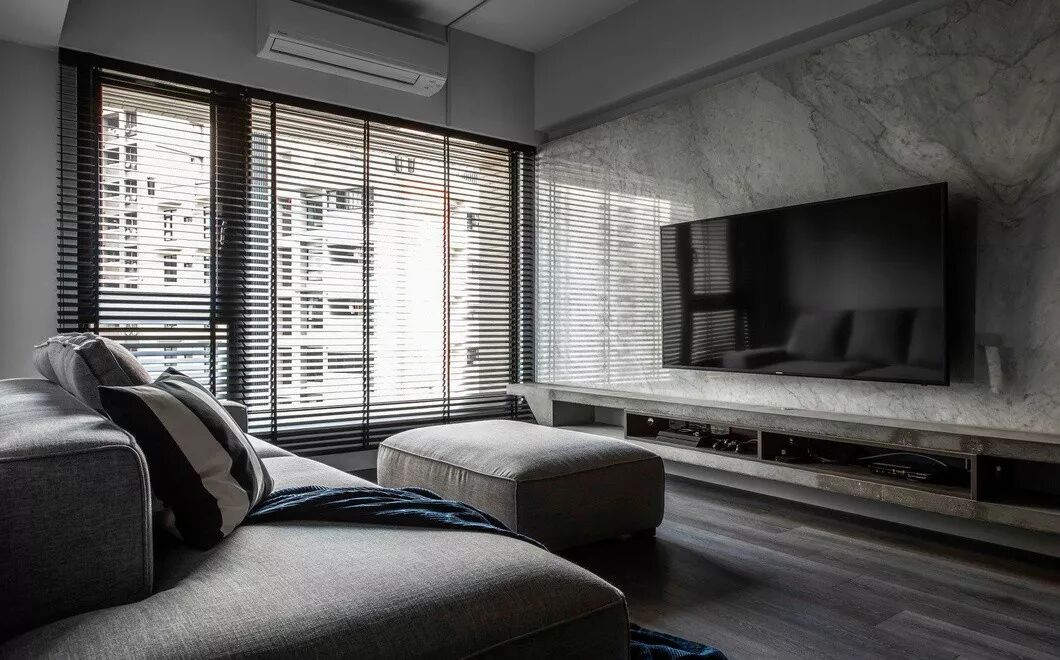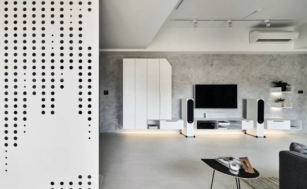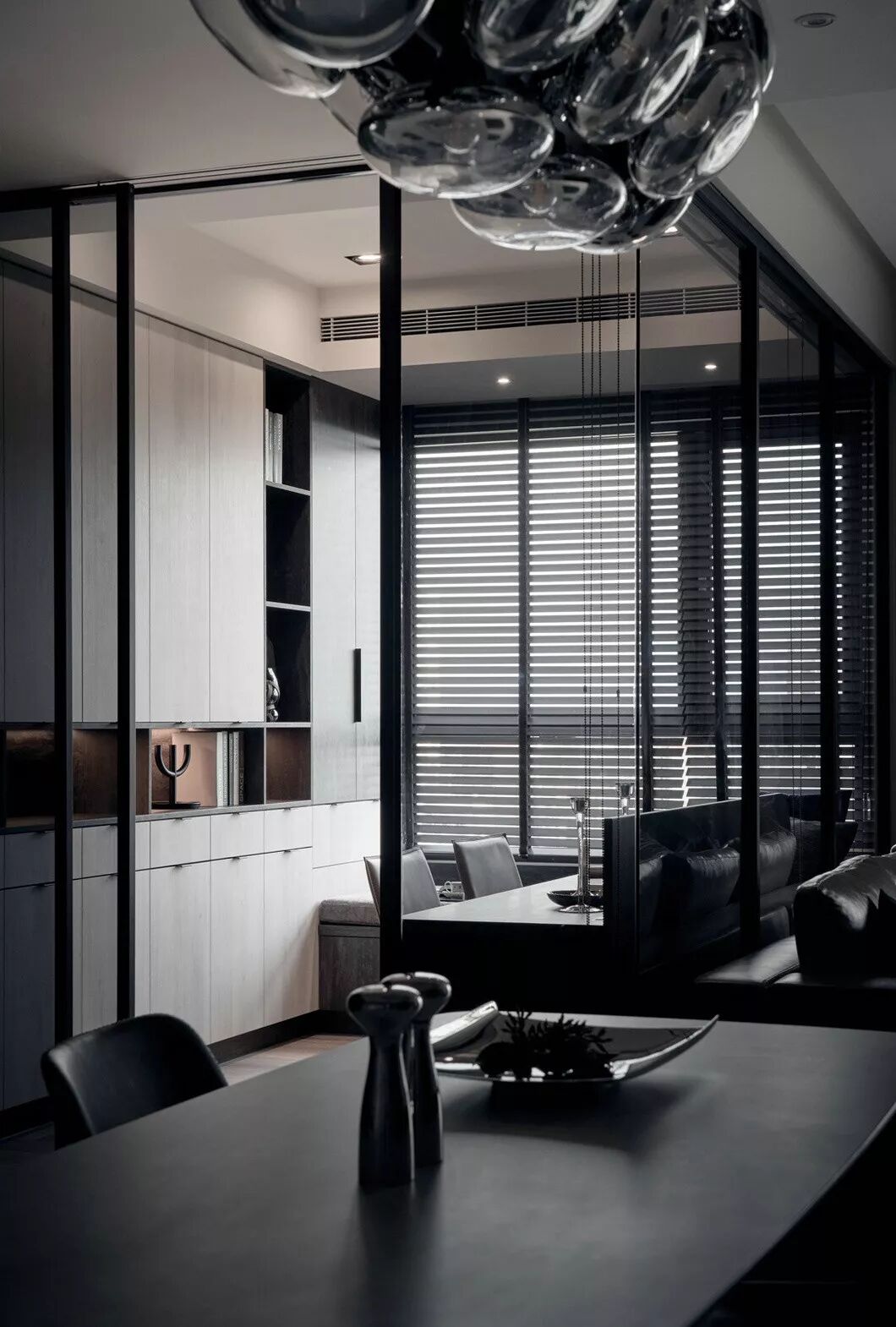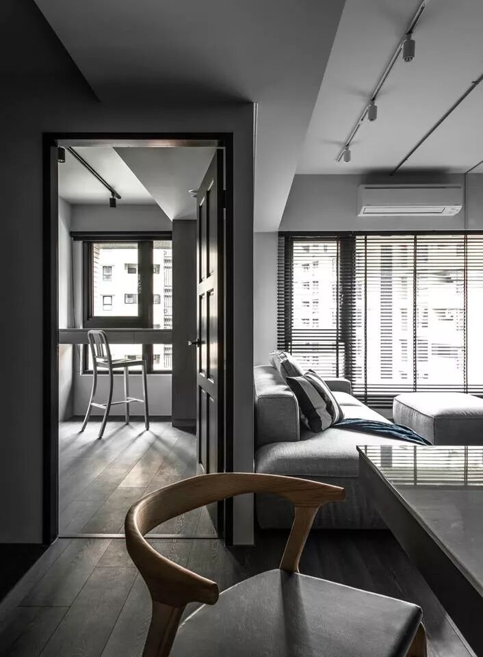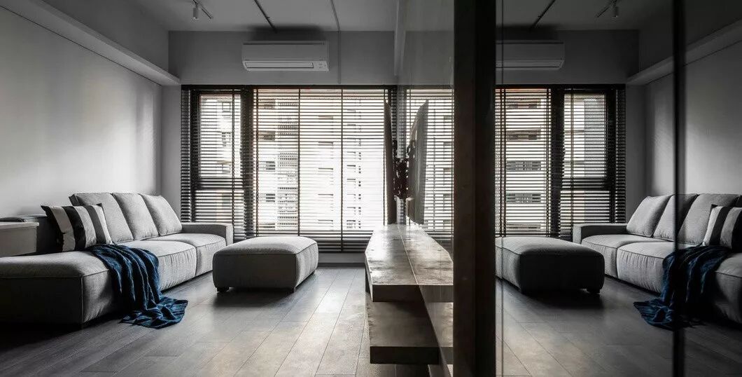 在这个案例中我们于狭长形的客-餐厅空间设计了一张自玄关开始延伸的中岛式大餐桌为了使空间在视觉上更为宽阔我们将餐桌做了悬臂的结构设计没有桌脚餐桌的长向斜边为空间中的重要轴线贯穿整体设计自玄关进入后餐桌- 电视墙水泥台面-天花板带状条灯同时平行于此轴线上除了空间方向性的暗示外也借此打破成规的垂直水平