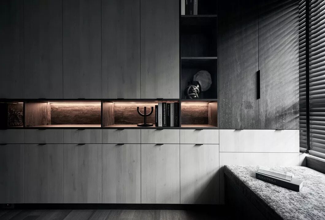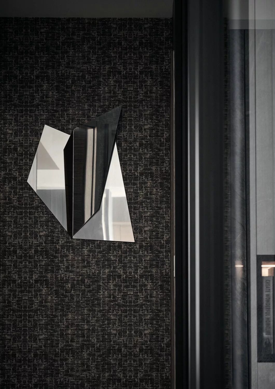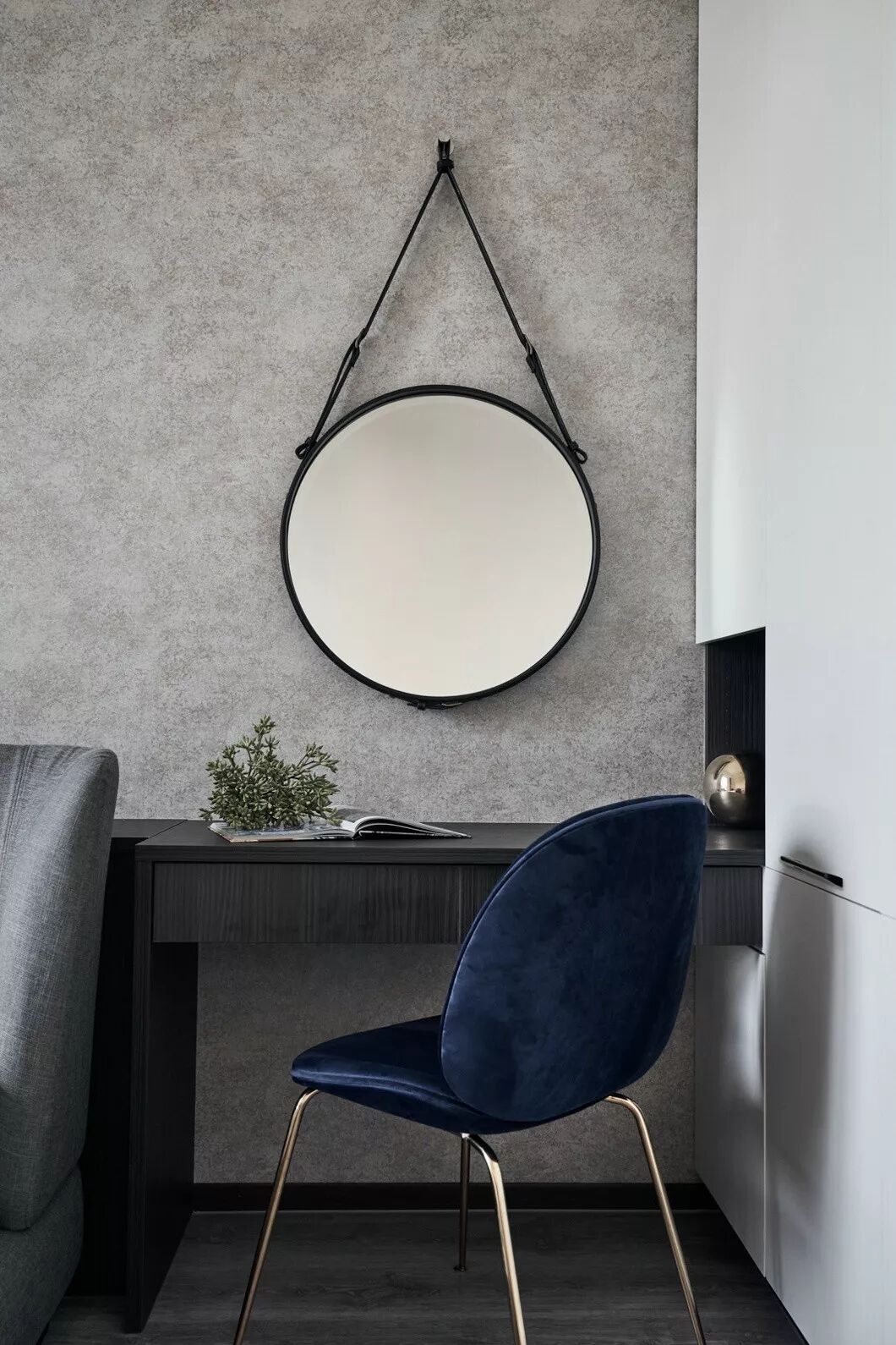 终于有一天,设计师倚靠对美好事物的洞悉,激发灵魂里属于艺术家的部分,创作出玄关处倾斜45度角一面全身镜、房门外切割重组的梳妆镜、镶在灰墙上几何挂饰⋯ ⋯不规则的玻璃造型有如散落的星兀自在空间里闪亮,为沈静色系点上光芒,为画面拼上最后一片迷人色块。