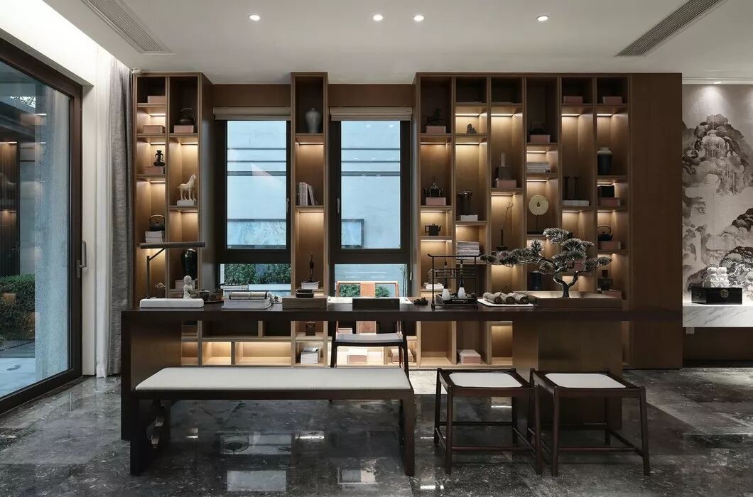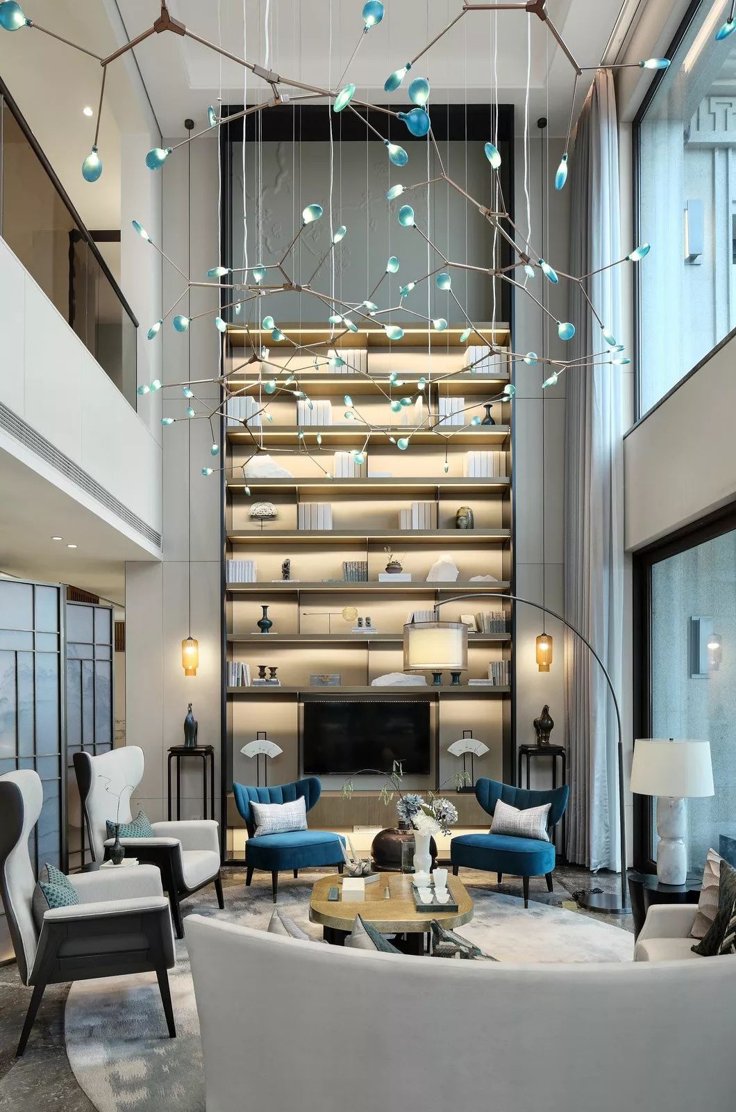 两层高的装饰柜强调出空间的气势,艺术品的设置提升了空间品味。