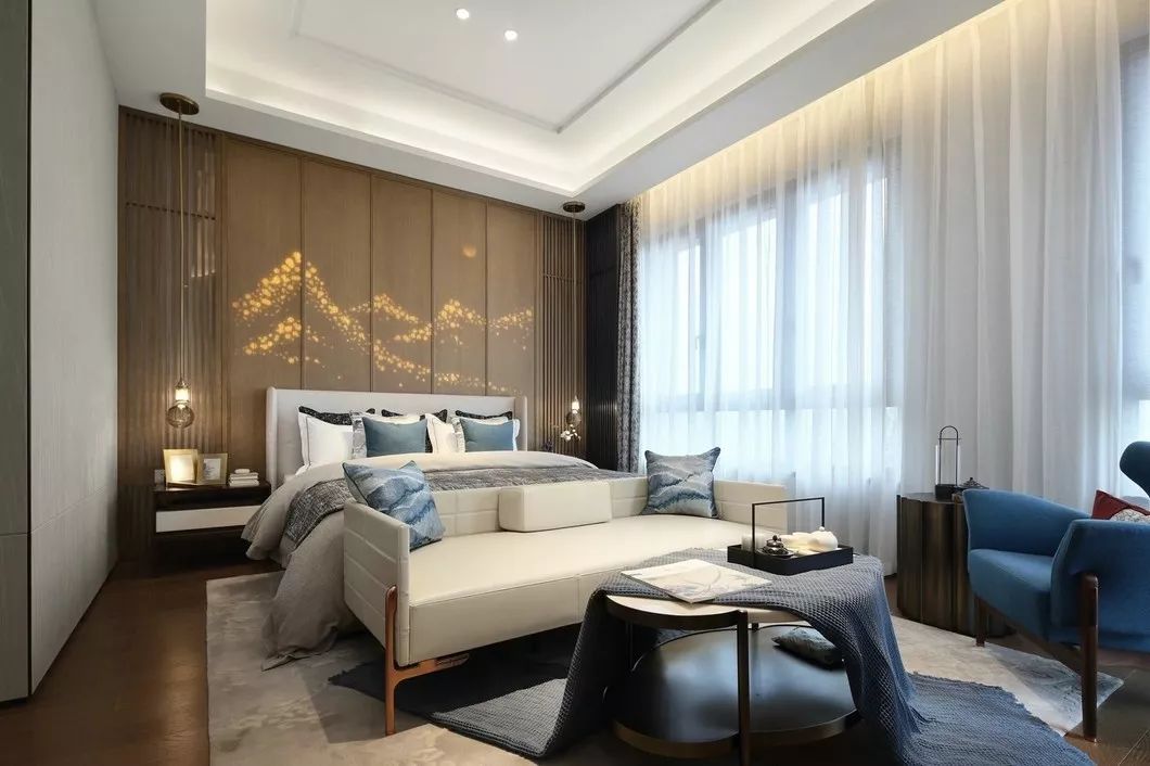 充满空间诗学的卧室,安静的色彩搭配,墙面的山水意境画传达出空灵之美,至此远离都市的喧嚣。