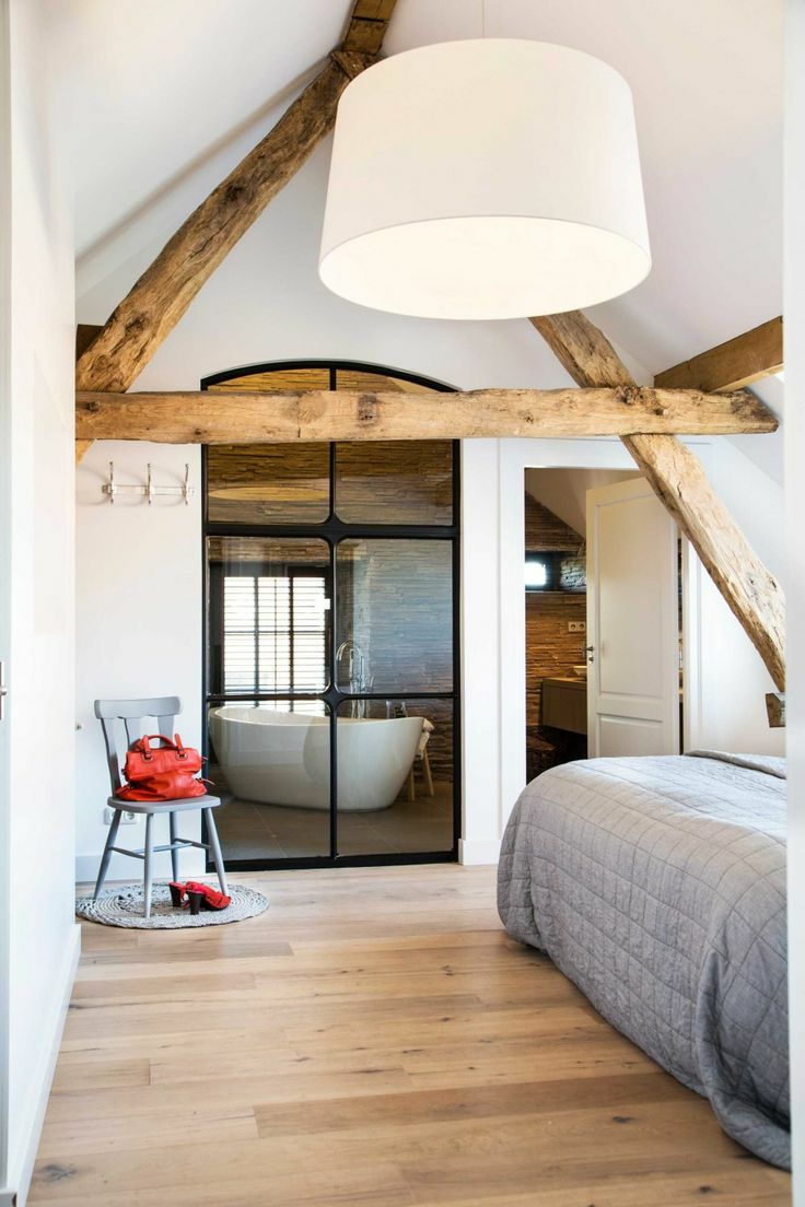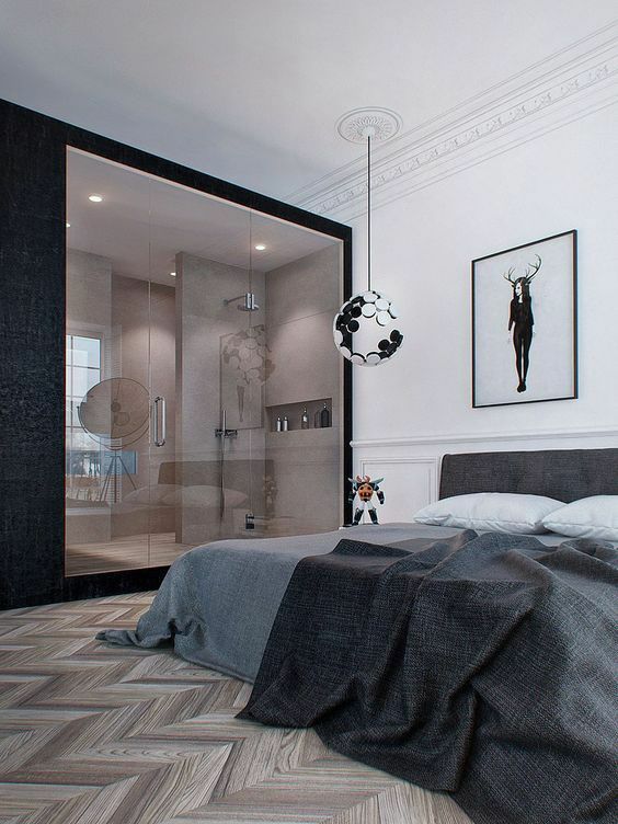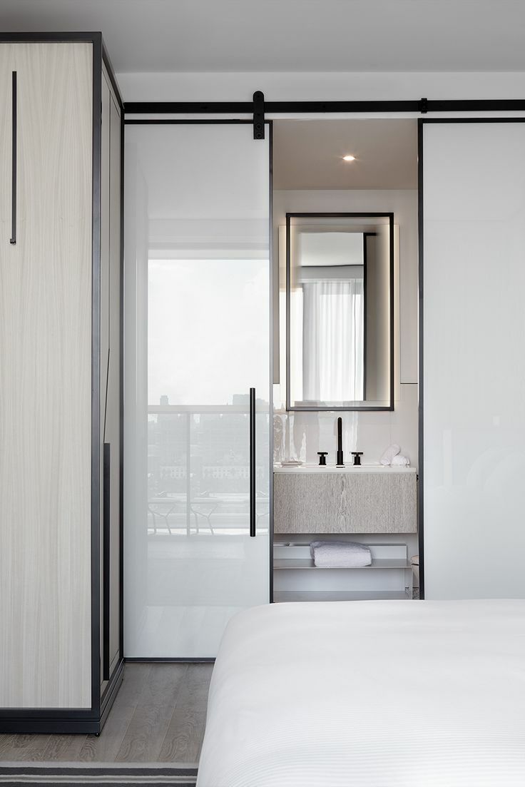 用黑框玻璃窗来阻断卫生间与卧室的界限,不仅可以解决暗卫本身存在的采光问题,而且视觉上更具时尚效果,令整个卧室的质感瞬间提升。