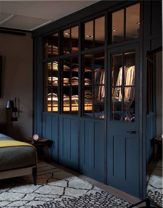 整个衣帽间被透明玻璃所包裹,内部设置灯带,营造一种橱窗式的感觉。各色各样的衣服仿佛也成为了空间的亮点,取放、查找一目了然。