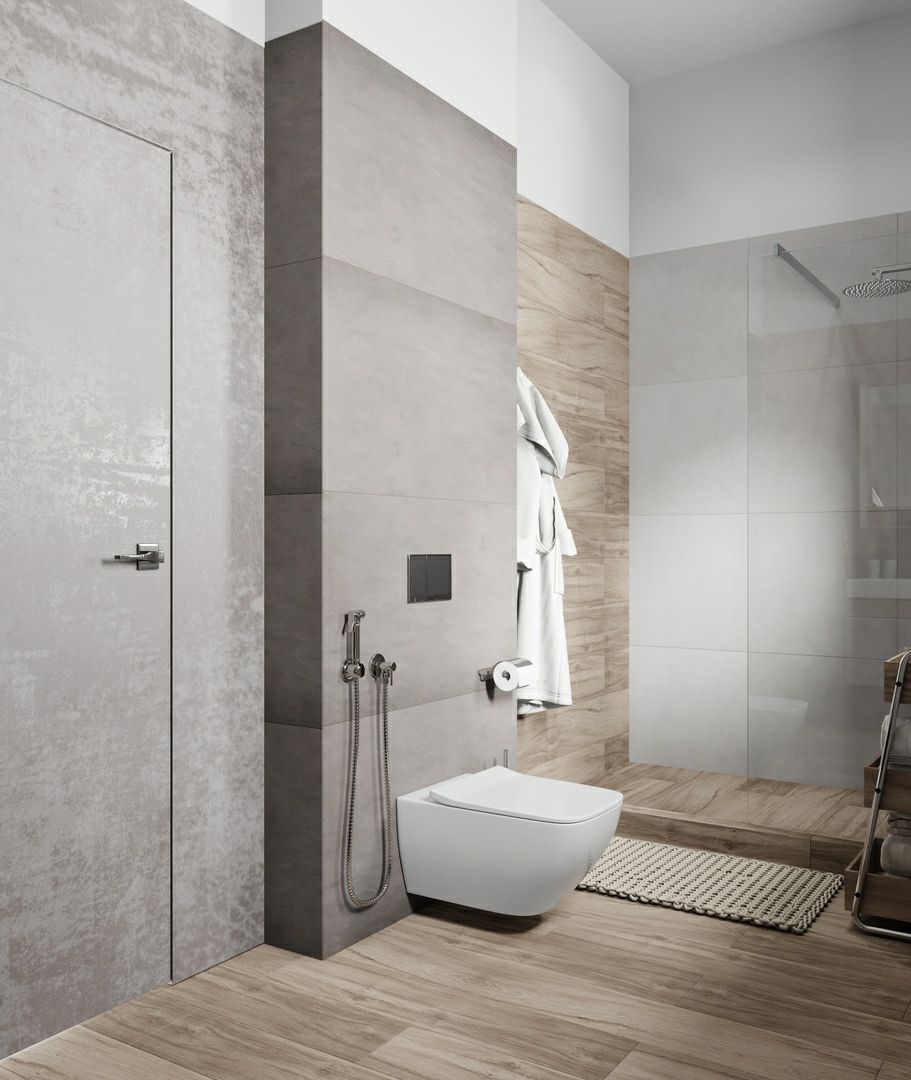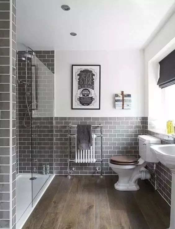 比如下面这个狭长的卫生间,墙面和地面的瓷砖都采用了横向拼接的铺贴方式,无形中增加了视觉上的宽度,空间平衡度变得更加和谐。