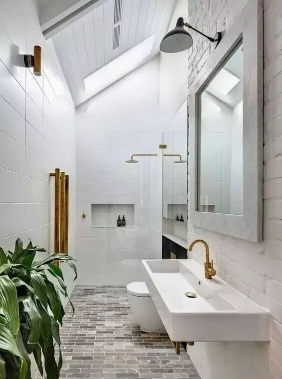 无论你家的浴室是典型的矩形还是奇形怪状,总能找到一个比其他地方稍长的墙壁或区域。在这些区域添加一个架子、一个瓷砖带,甚至一个简单的条纹墙漆都可以帮助你拉长房间最长的线条,并将视线吸引到最远位置,让空间产生延伸感。