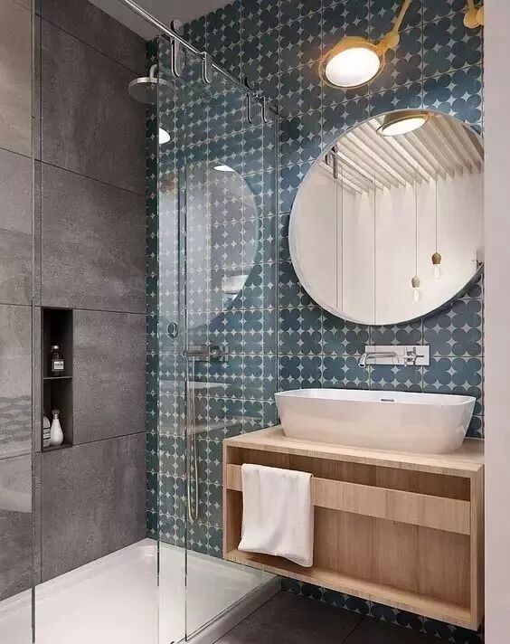 如果你不是白色的粉丝,可以通过温暖的米色,柔和的灰色甚至粉色系(粉蓝、粉红等)来营造空间的宽阔感。选择一款品位高雅的瓷砖,其余的墙面选取与之搭调的色系。整体效果宁静而温馨,不会造成视觉破裂而缩小你的空间感觉。