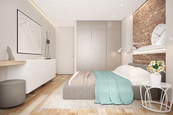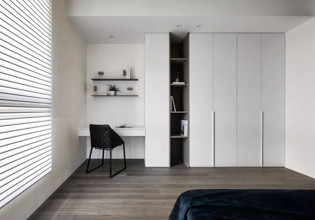 对于卧室面积小的户型来讲,鼓鼓推荐你的卧室衣柜用推拉门,这样即使衣柜贴着床头,也不用担心衣柜门打不开,而影响拿取衣物了。